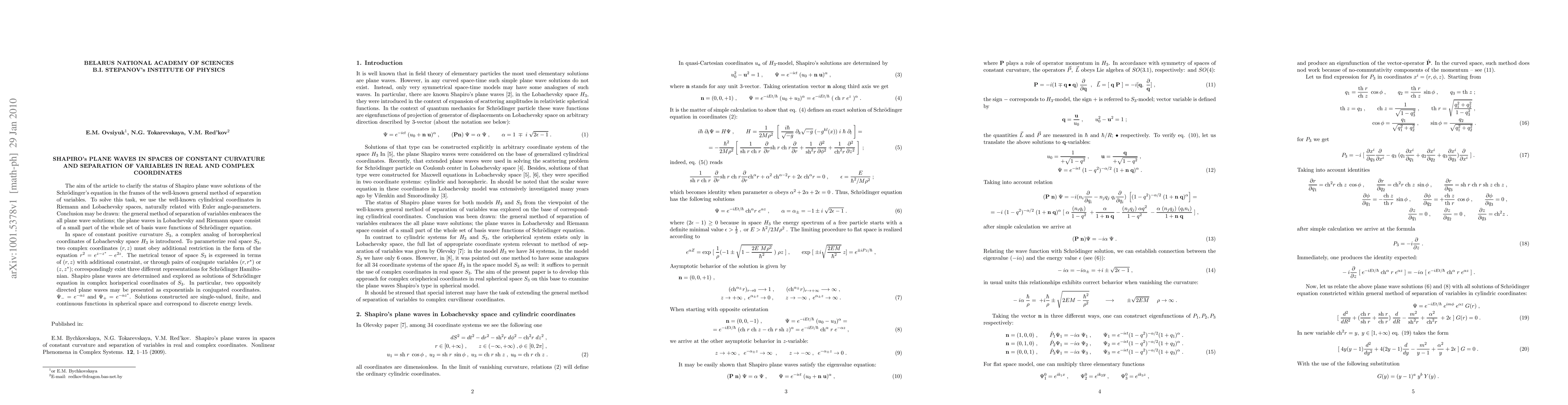The aim of the article to clarify the status of Shapiro plane wave solutions of the Schr\"odinger's equation in the frames of the well-known general method of separation of variables. To solve this task, we use the well-known cylindrical coordinates in Riemann and Lobachevsky spaces, naturally related with Euler angle-parameters. Conclusion may be drawn: the general method of separation of variables embraces the all plane wave solutions; the plane waves in Lobachevsky and Riemann space consist of a small part of the whole set of basis wave functions of Schr\"odinger equation. In space of constant positive curvature $S_{3}$, a complex analog of horospherical coordinates of Lobachevsky space $H_{3}$ is introduced. To parameterize real space $S_{3}$, two complex coordinates $(r,z)$ must obey additional restriction in the form of the equation $r^{2} = e^{z-z^{*}} - e^{2z} $. The metrical tensor of space $S_{3}$ is expressed in terms of $(r,z)$ with additional constraint, or through pairs of conjugate variables $(r,r^{*})$ or $(z,z^{*})$; correspondingly exist three different representations for Schr\"{o}dinger Hamiltonian. Shapiro plane waves are determined and explored as solutions of Schr\"odinger equation in complex horosperical coordinates of $S_{3}$. In particular, two oppositely directed plane waves may be presented as exponentials in conjugated coordinates. $\Psi_{-}= e^{-\alpha z}$ and $\Psi_{+}= e^{-\alpha z^{*}}$. Solutions constructed are single-valued, finite, and continuous functions in spherical space and correspond to discrete energy levels.