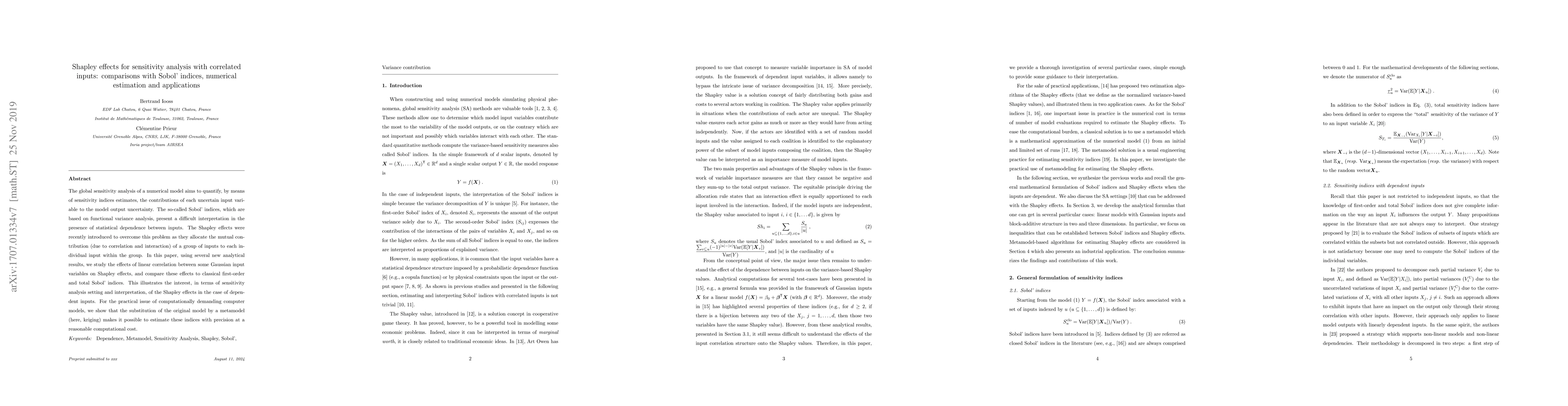 This paper investigates the Shapley effects for sensitivity analysis in the context of correlated input variables, comparing them to Sobol' indices. It demonstrates the advantages of Shapley effects in interpreting the contributions of dependent inputs and proposes a method using metamodels to efficiently estimate these indices.
