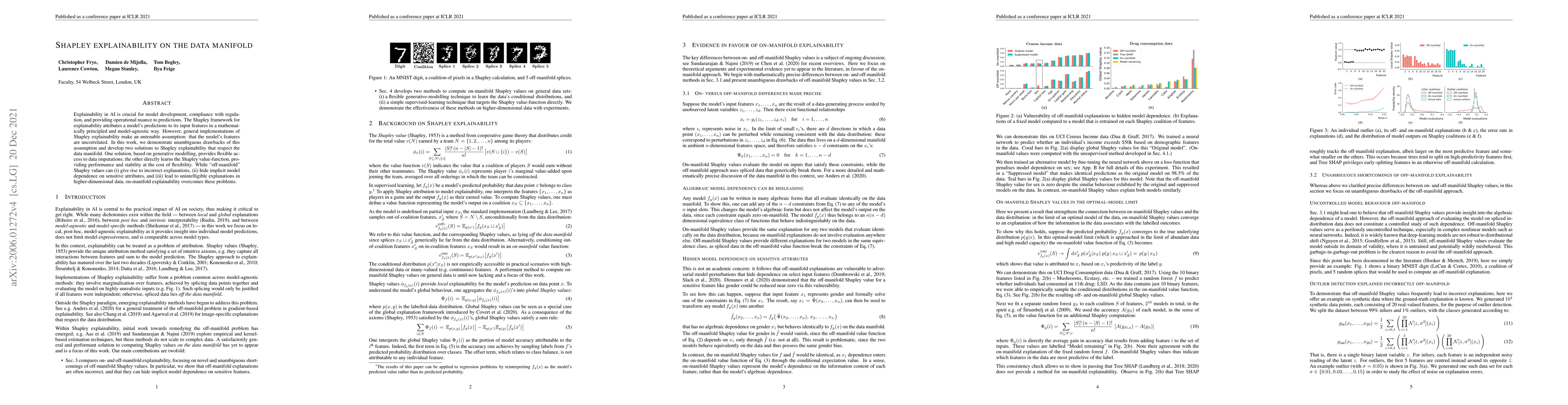 Explainability in AI is crucial for model development, compliance with regulation, and providing operational nuance to predictions. The Shapley framework for explainability attributes a model's predictions to its input features in a mathematically principled and model-agnostic way. However, general implementations of Shapley explainability make an untenable assumption: that the model's features are uncorrelated. In this work, we demonstrate unambiguous drawbacks of this assumption and develop two solutions to Shapley explainability that respect the data manifold. One solution, based on generative modelling, provides flexible access to data imputations; the other directly learns the Shapley value-function, providing performance and stability at the cost of flexibility. While "off-manifold" Shapley values can (i) give rise to incorrect explanations, (ii) hide implicit model dependence on sensitive attributes, and (iii) lead to unintelligible explanations in higher-dimensional data, on-manifold explainability overcomes these problems.