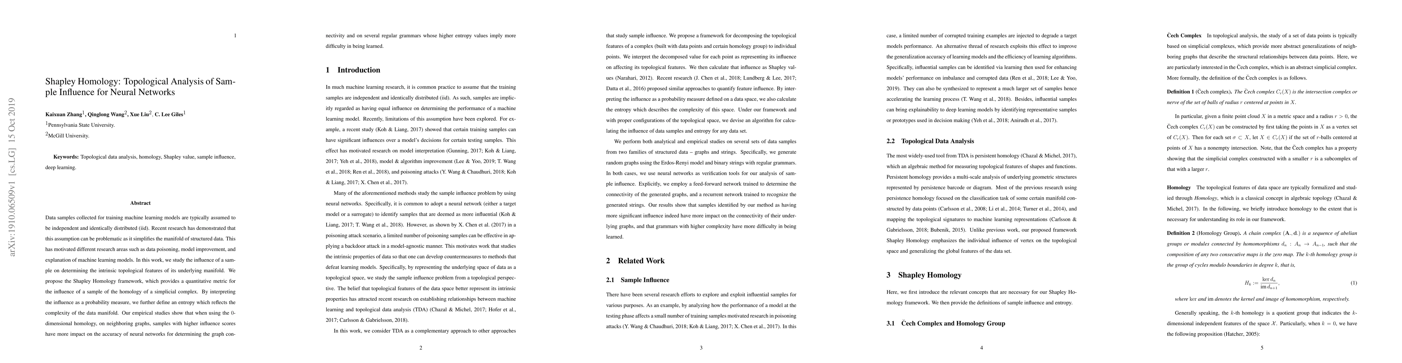 Data samples collected for training machine learning models are typically assumed to be independent and identically distributed (iid). Recent research has demonstrated that this assumption can be problematic as it simplifies the manifold of structured data. This has motivated different research areas such as data poisoning, model improvement, and explanation of machine learning models. In this work, we study the influence of a sample on determining the intrinsic topological features of its underlying manifold. We propose the Shapley Homology framework, which provides a quantitative metric for the influence of a sample of the homology of a simplicial complex. By interpreting the influence as a probability measure, we further define an entropy which reflects the complexity of the data manifold. Our empirical studies show that when using the 0-dimensional homology, on neighboring graphs, samples with higher influence scores have more impact on the accuracy of neural networks for determining the graph connectivity and on several regular grammars whose higher entropy values imply more difficulty in being learned.