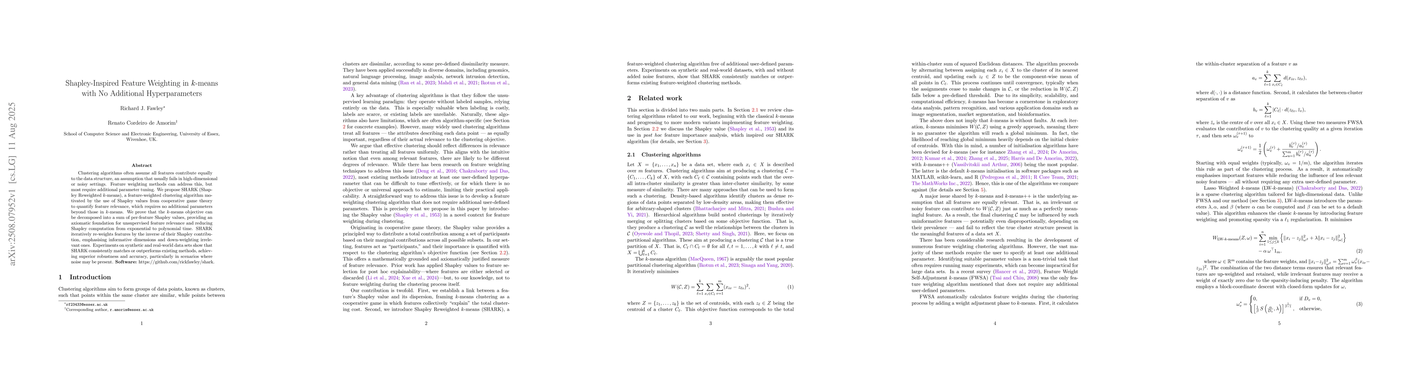 Clustering algorithms often assume all features contribute equally to the data structure, an assumption that usually fails in high-dimensional or noisy settings. Feature weighting methods can address this, but most require additional parameter tuning. We propose SHARK (Shapley Reweighted $k$-means), a feature-weighted clustering algorithm motivated by the use of Shapley values from cooperative game theory to quantify feature relevance, which requires no additional parameters beyond those in $k$-means. We prove that the $k$-means objective can be decomposed into a sum of per-feature Shapley values, providing an axiomatic foundation for unsupervised feature relevance and reducing Shapley computation from exponential to polynomial time. SHARK iteratively re-weights features by the inverse of their Shapley contribution, emphasising informative dimensions and down-weighting irrelevant ones. Experiments on synthetic and real-world data sets show that SHARK consistently matches or outperforms existing methods, achieving superior robustness and accuracy, particularly in scenarios where noise may be present. Software: https://github.com/rickfawley/shark.