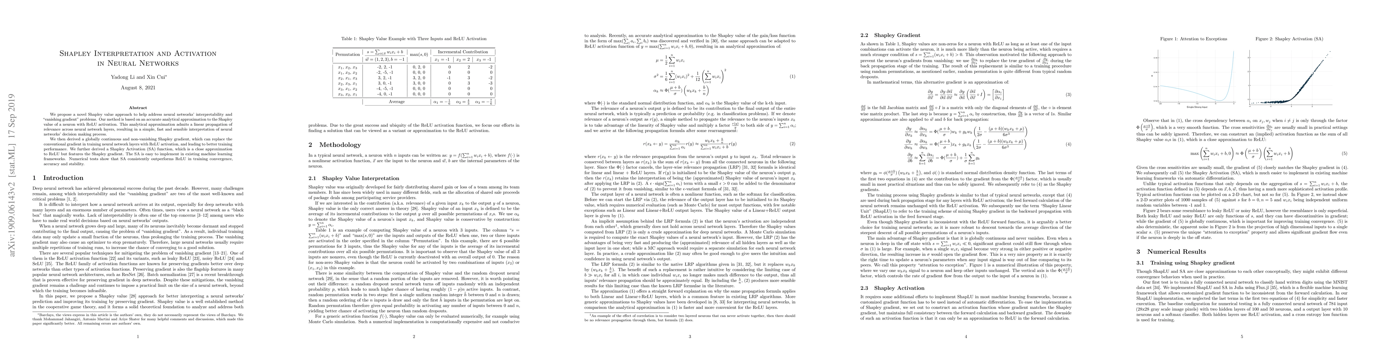We propose a novel Shapley value approach to help address neural networks' interpretability and "vanishing gradient" problems. Our method is based on an accurate analytical approximation to the Shapley value of a neuron with ReLU activation. This analytical approximation admits a linear propagation of relevance across neural network layers, resulting in a simple, fast and sensible interpretation of neural networks' decision making process. We then derived a globally continuous and non-vanishing Shapley gradient, which can replace the conventional gradient in training neural network layers with ReLU activation, and leading to better training performance. We further derived a Shapley Activation (SA) function, which is a close approximation to ReLU but features the Shapley gradient. The SA is easy to implement in existing machine learning frameworks. Numerical tests show that SA consistently outperforms ReLU in training convergence, accuracy and stability.
