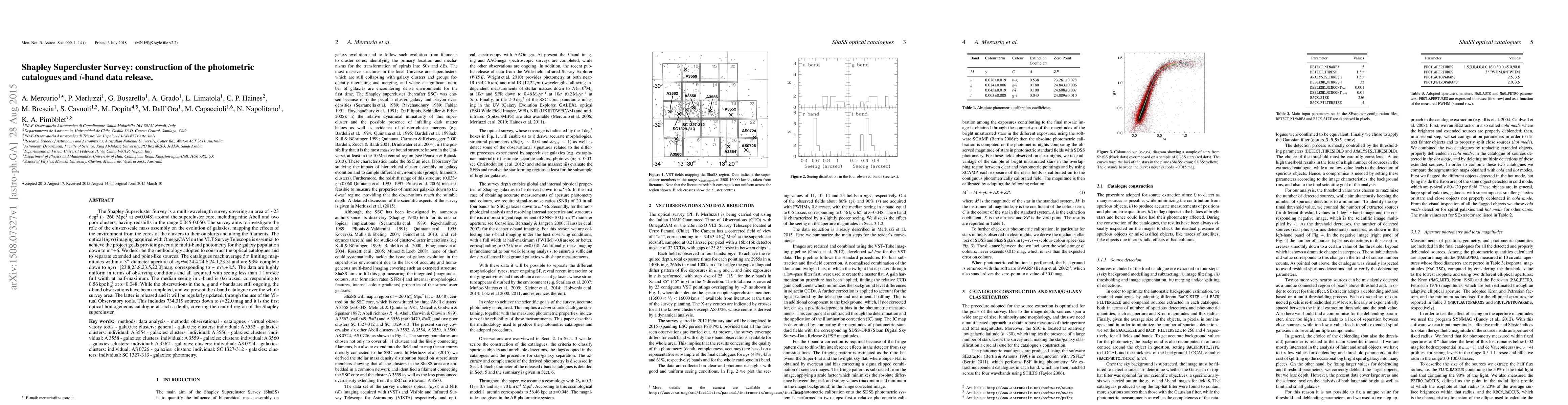 The Shapley Supercluster Survey has constructed photometric catalogues and released i-band data, providing accurate multi-band photometry for galaxies down to m*+6. The i-band catalogue includes 734,319 sources and is the first homogeneous optical catalogue at such depth for the central region of the Shapley supercluster.