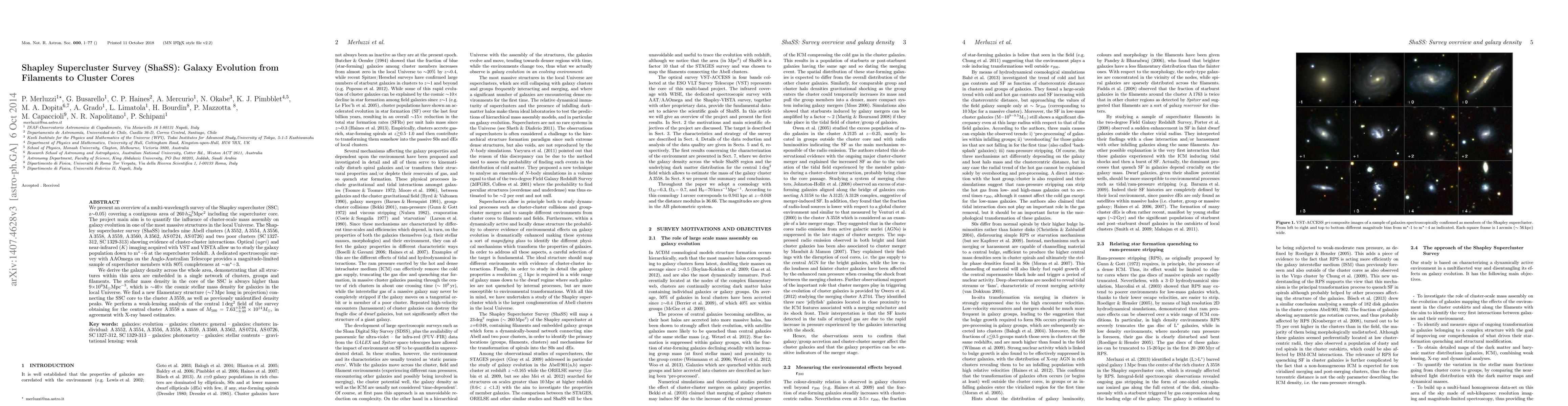 The Shapley Supercluster Survey (ShaSS) investigates galaxy evolution across the Shapley supercluster using multi-wavelength data, revealing a dense network of clusters, groups, and filaments. The survey finds that the core's stellar mass density is ~40 times the cosmic average, highlighting the influence of cluster-scale mass assembly on galaxy evolution.