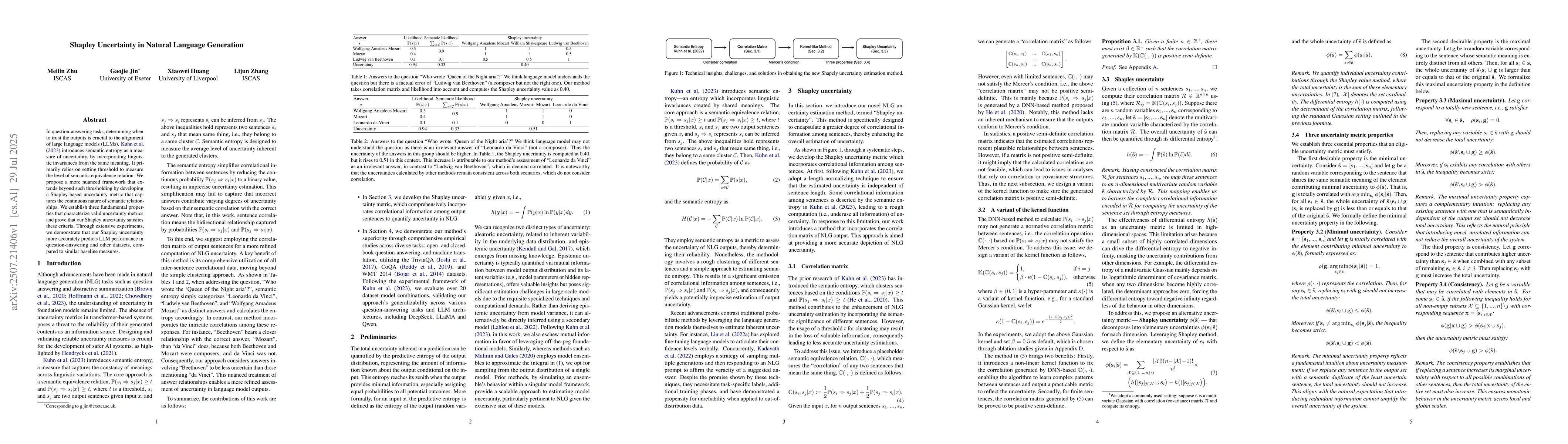 In question-answering tasks, determining when to trust the outputs is crucial to the alignment of large language models (LLMs). Kuhn et al. (2023) introduces semantic entropy as a measure of uncertainty, by incorporating linguistic invariances from the same meaning. It primarily relies on setting threshold to measure the level of semantic equivalence relation. We propose a more nuanced framework that extends beyond such thresholding by developing a Shapley-based uncertainty metric that captures the continuous nature of semantic relationships. We establish three fundamental properties that characterize valid uncertainty metrics and prove that our Shapley uncertainty satisfies these criteria. Through extensive experiments, we demonstrate that our Shapley uncertainty more accurately predicts LLM performance in question-answering and other datasets, compared to similar baseline measures.