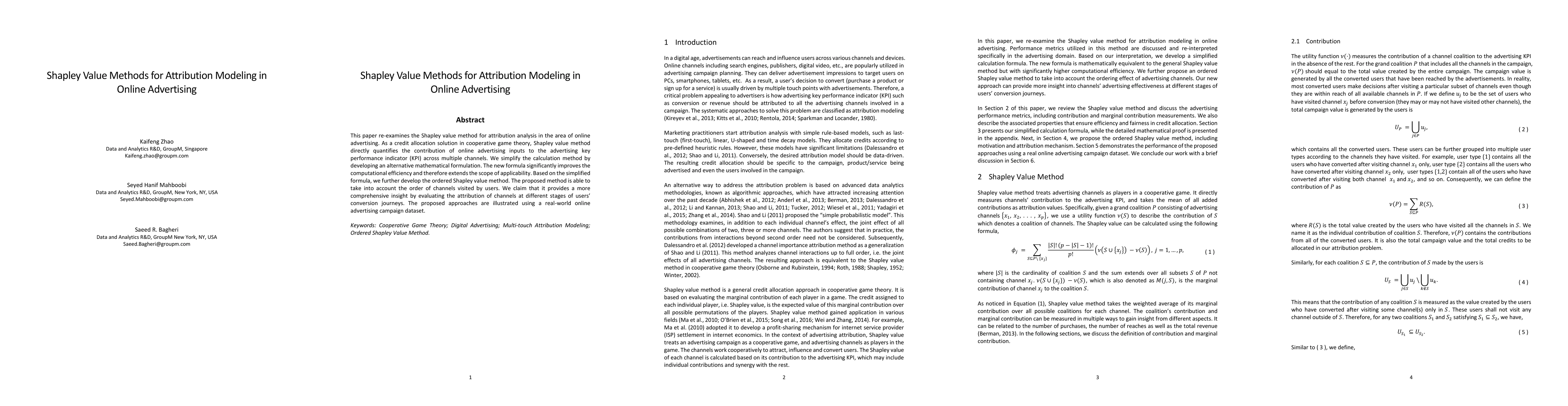 This paper re-examines the Shapley value methods for attribution analysis in the area of online advertising. As a credit allocation solution in cooperative game theory, Shapley value method directly quantifies the contribution of online advertising inputs to the advertising key performance indicator (KPI) across multiple channels. We simplify its calculation by developing an alternative mathematical formulation. The new formula significantly improves the computational efficiency and therefore extends the scope of applicability. Based on the simplified formula, we further develop the ordered Shapley value method. The proposed method is able to take into account the order of channels visited by users. We claim that it provides a more comprehensive insight by evaluating the attribution of channels at different stages of user conversion journeys. The proposed approaches are illustrated using a real-world online advertising campaign dataset.