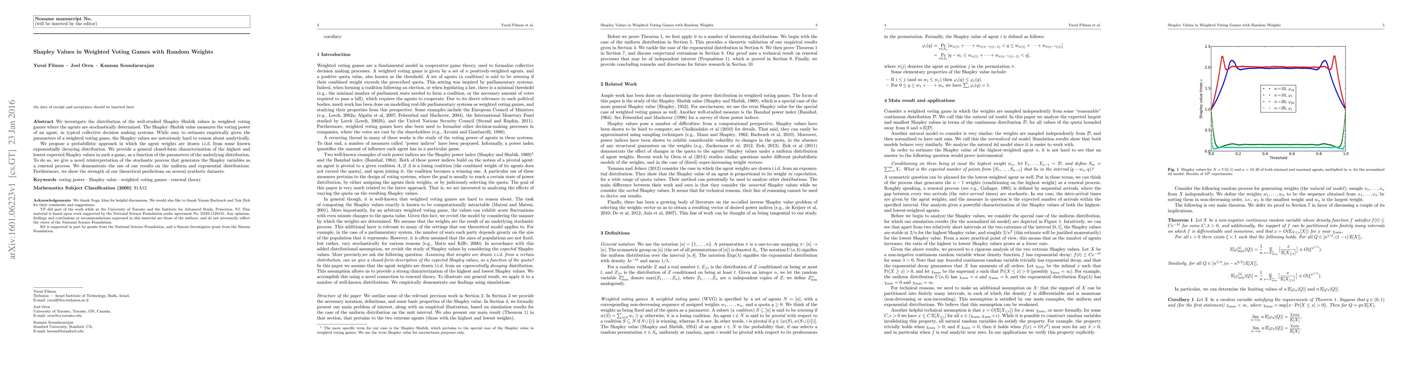 The paper investigates Shapley values in weighted voting games with random weights, proposing a probabilistic approach where agent weights are drawn i.i.d. from an exponentially decaying distribution. It provides a general closed-form characterization of the highest and lowest expected Shapley values.