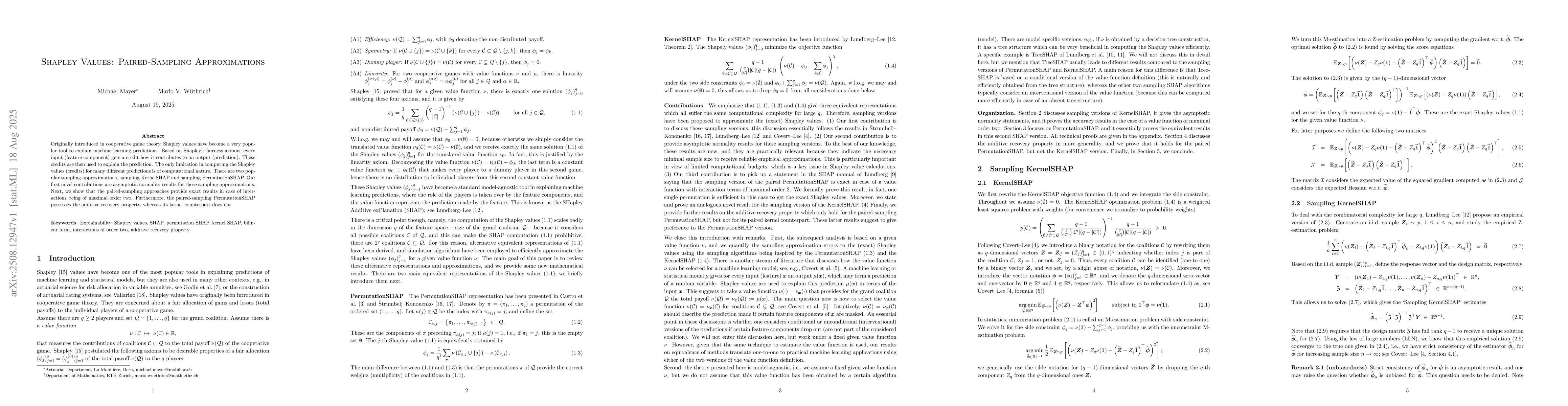 Originally introduced in cooperative game theory, Shapley values have become a very popular tool to explain machine learning predictions. Based on Shapley's fairness axioms, every input (feature component) gets a credit how it contributes to an output (prediction). These credits are then used to explain the prediction. The only limitation in computing the Shapley values (credits) for many different predictions is of computational nature. There are two popular sampling approximations, sampling KernelSHAP and sampling PermutationSHAP. Our first novel contributions are asymptotic normality results for these sampling approximations. Next, we show that the paired-sampling approaches provide exact results in case of interactions being of maximal order two. Furthermore, the paired-sampling PermutationSHAP possesses the additive recovery property, whereas its kernel counterpart does not.