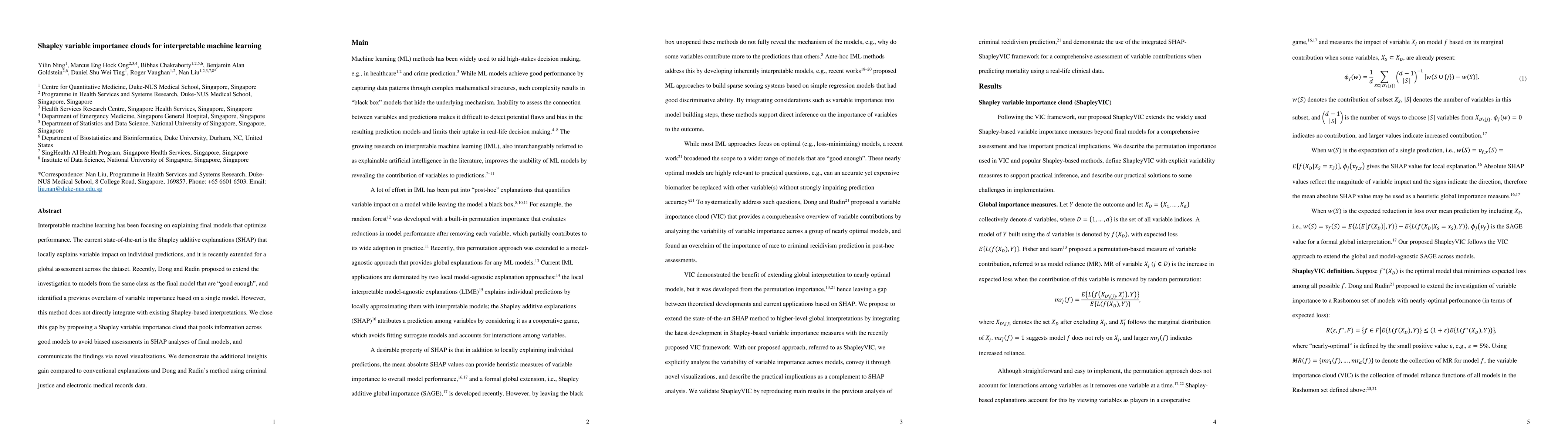 This paper proposes a Shapley variable importance cloud to provide a more accurate and unbiased assessment of variable importance in machine learning models by pooling information across multiple "good enough" models, rather than relying on a single model. The method is demonstrated to offer additional insights compared to conventional SHAP explanations and Dong and Rudin's approach, using real-world datasets from criminal justice and electronic medical records.
