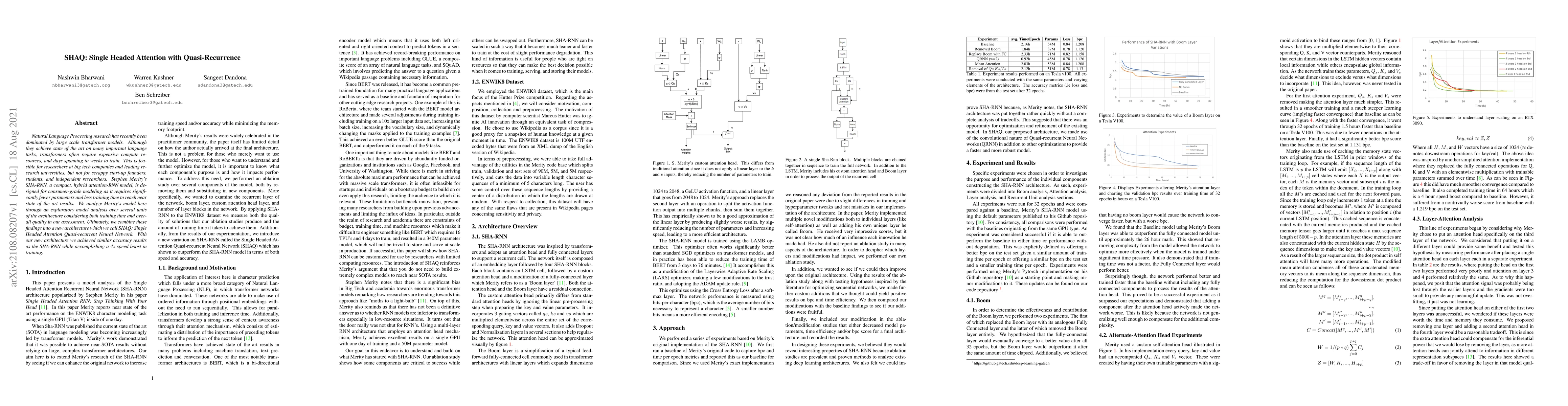 Natural Language Processing research has recently been dominated by large scale transformer models. Although they achieve state of the art on many important language tasks, transformers often require expensive compute resources, and days spanning to weeks to train. This is feasible for researchers at big tech companies and leading research universities, but not for scrappy start-up founders, students, and independent researchers. Stephen Merity's SHA-RNN, a compact, hybrid attention-RNN model, is designed for consumer-grade modeling as it requires significantly fewer parameters and less training time to reach near state of the art results. We analyze Merity's model here through an exploratory model analysis over several units of the architecture considering both training time and overall quality in our assessment. Ultimately, we combine these findings into a new architecture which we call SHAQ: Single Headed Attention Quasi-recurrent Neural Network. With our new architecture we achieved similar accuracy results as the SHA-RNN while accomplishing a 4x speed boost in training.