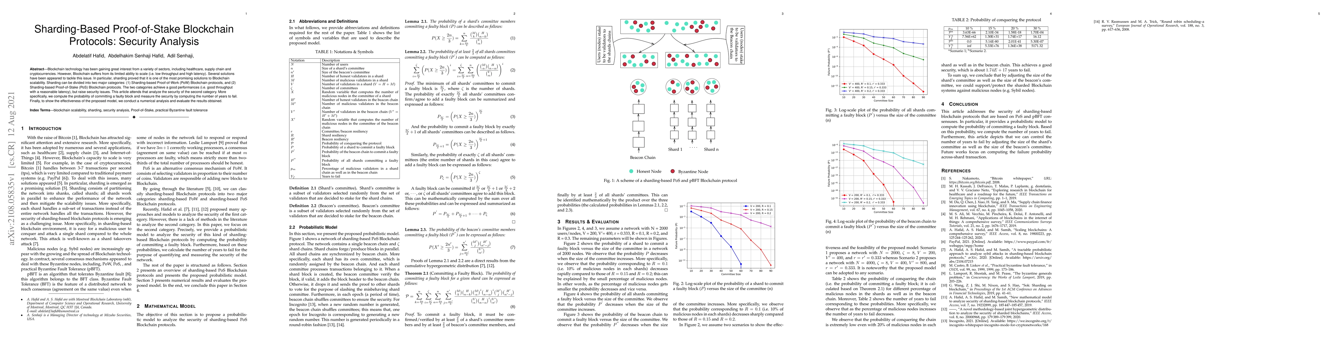 Blockchain technology has been gaining great interest from a variety of sectors, including healthcare, supply chain and cryptocurrencies. However, Blockchain suffers from its limited ability to scale (i.e. low throughput and high latency). Several solutions have been appeared to tackle this issue. In particular, sharding proved that it is one of the most promising solutions to Blockchain scalability. Sharding can be divided into two major categories: (1) Sharding-based Proof-of-Work (PoW) Blockchain protocols, and (2) Sharding-based Proof-of-Stake (PoS) Blockchain protocols. The two categories achieve a good performances (i.e. good throughput with a reasonable latency), but raise security issues. This article attends that analyze the security of the second category. More specifically, we compute the probability of committing a faulty block and measure the security by computing the number of years to fail. Finally, to show the effectiveness of the proposed model, we conduct a numerical analysis and evaluate the results obtained.