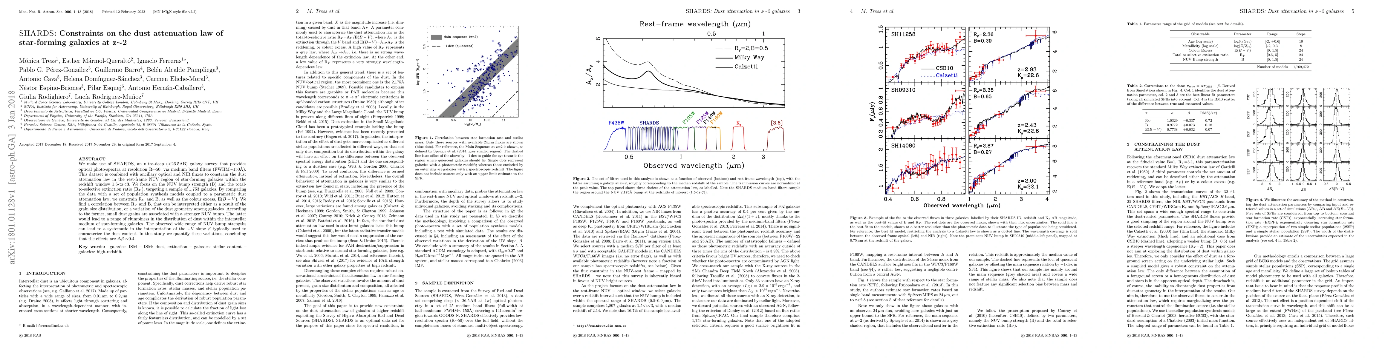 This paper uses SHARDS data to constrain the dust attenuation law in star-forming galaxies at z~2, finding correlations between NUV bump strength and total-to-selective extinction ratio, which suggest variations in grain size distribution or dust geometry. The study concludes that these variations introduce a systematic error of $\Delta\beta$~0.4 in the UV slope used to characterize dust content.
