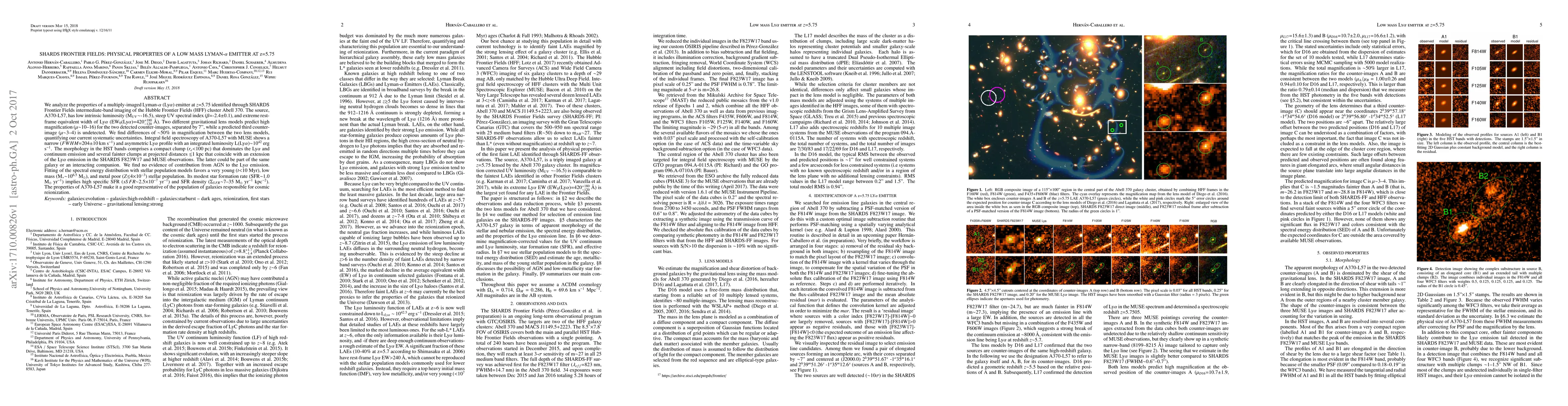 We analyze the properties of a multiply-imaged Lyman-alpha (Lya) emitter at z=5.75 identified through SHARDS Frontier Fields intermediate-band imaging of the Hubble Frontier Fields (HFF) cluster Abell 370. The source, A370-L57, has low intrinsic luminosity (M_UV~-16.5), steep UV spectral index (\beta=-2.4+/-0.1), and extreme rest-frame equivalent width of Lya (EW(Lya)=420+180-120 \AA). Two different gravitational lens models predict high magnification (\mu~10--16) for the two detected counter-images, separated by 7", while a predicted third counter-image (\mu~3--4) is undetected. We find differences of ~50% in magnification between the two lens models, quantifying our current systematic uncertainties. Integral field spectroscopy of A370-L57 with MUSE shows a narrow (FWHM=204+/-10 km/s) and asymmetric Lya profile with an integrated luminosity L(Lya)~10^42 erg/s. The morphology in the HST bands comprises a compact clump (r_e<100 pc) that dominates the Lya and continuum emission and several fainter clumps at projected distances <1 kpc that coincide with an extension of the Lya emission in the SHARDS F823W17 and MUSE observations. The latter could be part of the same galaxy or an interacting companion. We find no evidence of contribution from AGN to the Lya emission. Fitting of the spectral energy distribution with stellar population models favors a very young (t<10 Myr), low mass (M*~10^6.5 Msun), and metal poor (Z<4x10^-3) stellar population. Its modest star formation rate (SFR~1.0 Msun/yr) implies high specific SFR (sSFR~2.5x10^-7 yr^-1) and SFR density (Sigma_SFR ~ 7-35 Msun/yr/kpc^2). The properties of A370-L57 make it a good representative of the population of galaxies responsible for cosmic reionization.