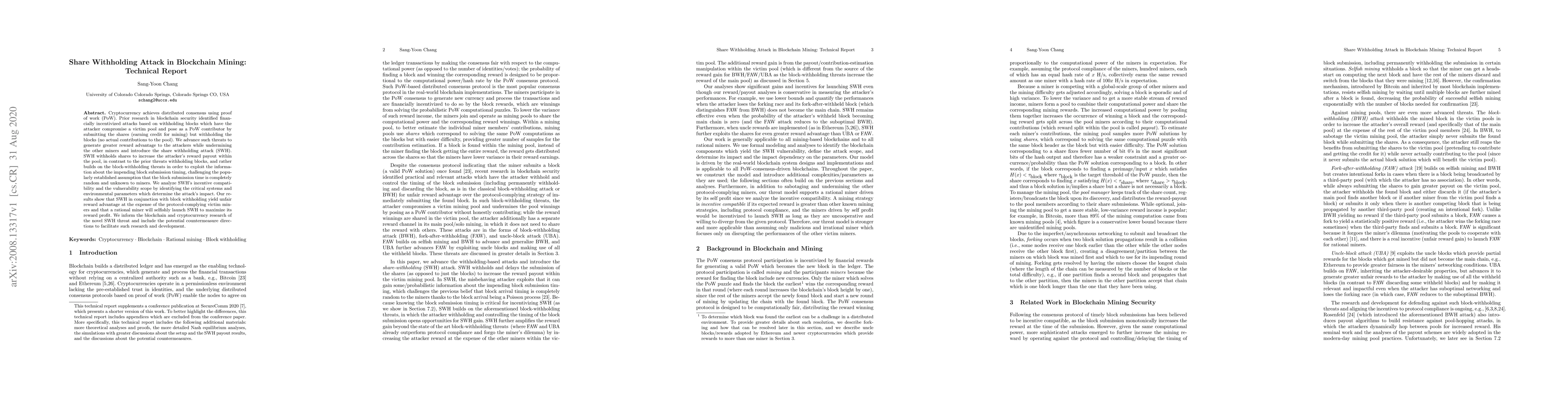 Cryptocurrency achieves distributed consensus using proof of work (PoW). Prior research in blockchain security identified financially incentivized attacks based on withholding blocks which have the attacker compromise a victim pool and pose as a PoW contributor by submitting the shares (earning credit for mining) but withholding the blocks (no actual contributions to the pool). We advance such threats to generate greater reward advantage to the attackers while undermining the other miners and introduce the share withholding attack (SWH). SWH withholds shares to increase the attacker's reward payout within the pool, in contrast to the prior threats withholding blocks, and rather builds on the block-withholding threats in order to exploit the information about the impending block submission timing, challenging the popularly established assumption that the block submission time is completely random and unknown to miners. We analyze SWH's incentive compatibility and the vulnerability scope by identifying the critical systems and environmental parameters which determine the attack's impact. Our results show that SWH in conjunction with block withholding yield unfair reward advantage at the expense of the protocol-complying victim miners and that a rational miner will selfishly launch SWH to maximize its reward profit. We inform the blockchain and cryptocurrency research of the novel SWH threat and include the potential countermeasure directions to facilitate such research and development.