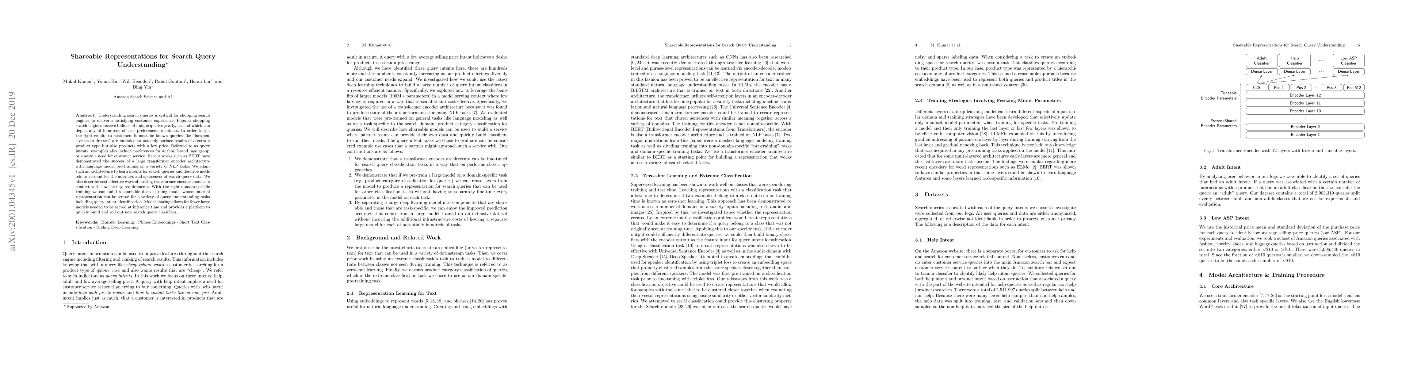 Understanding search queries is critical for shopping search engines to deliver a satisfying customer experience. Popular shopping search engines receive billions of unique queries yearly, each of which can depict any of hundreds of user preferences or intents. In order to get the right results to customers it must be known queries like "inexpensive prom dresses" are intended to not only surface results of a certain product type but also products with a low price. Referred to as query intents, examples also include preferences for author, brand, age group, or simply a need for customer service. Recent works such as BERT have demonstrated the success of a large transformer encoder architecture with language model pre-training on a variety of NLP tasks. We adapt such an architecture to learn intents for search queries and describe methods to account for the noisiness and sparseness of search query data. We also describe cost effective ways of hosting transformer encoder models in context with low latency requirements. With the right domain-specific training we can build a shareable deep learning model whose internal representation can be reused for a variety of query understanding tasks including query intent identification. Model sharing allows for fewer large models needed to be served at inference time and provides a platform to quickly build and roll out new search query classifiers.