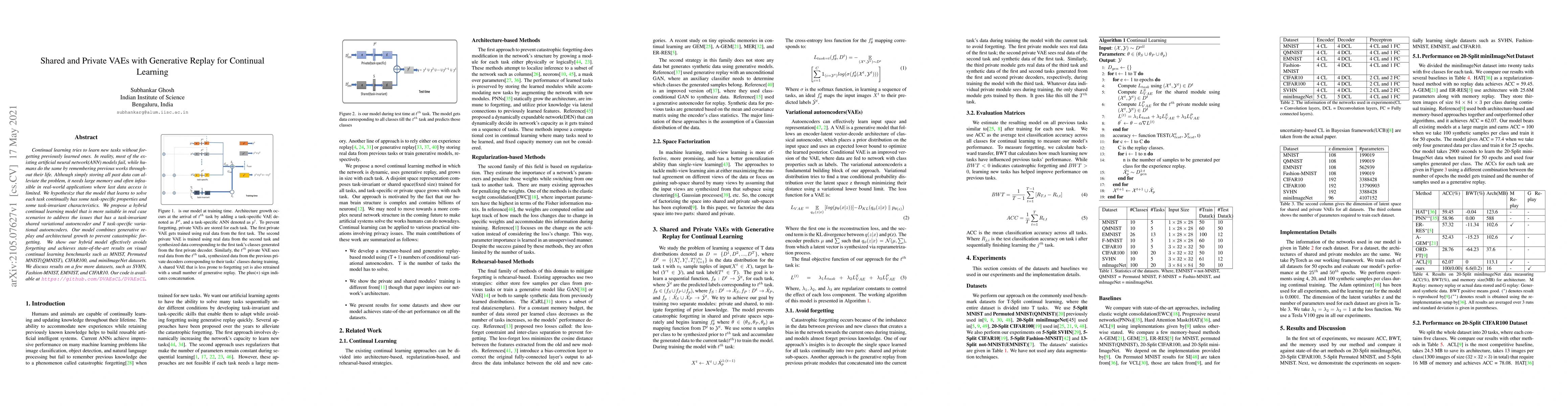 This paper proposes a hybrid continual learning model combining shared and private variational autoencoders with generative replay to prevent catastrophic forgetting. The model achieves state-of-the-art results on various visual datasets, demonstrating effective continual learning without forgetting previous tasks.