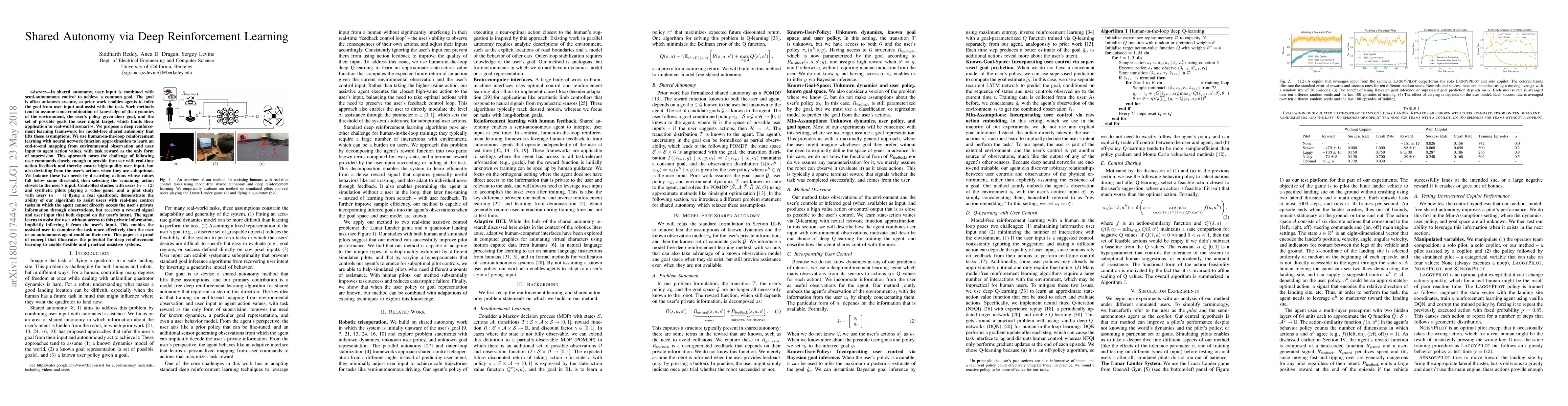 This paper proposes a deep reinforcement learning framework for model-free shared autonomy, enabling agents to assist users without prior knowledge of task dynamics or user goals. The approach uses human-in-the-loop reinforcement learning to learn an end-to-end mapping from observations and user inputs, balancing close adherence to user commands with the ability to deviate when necessary.