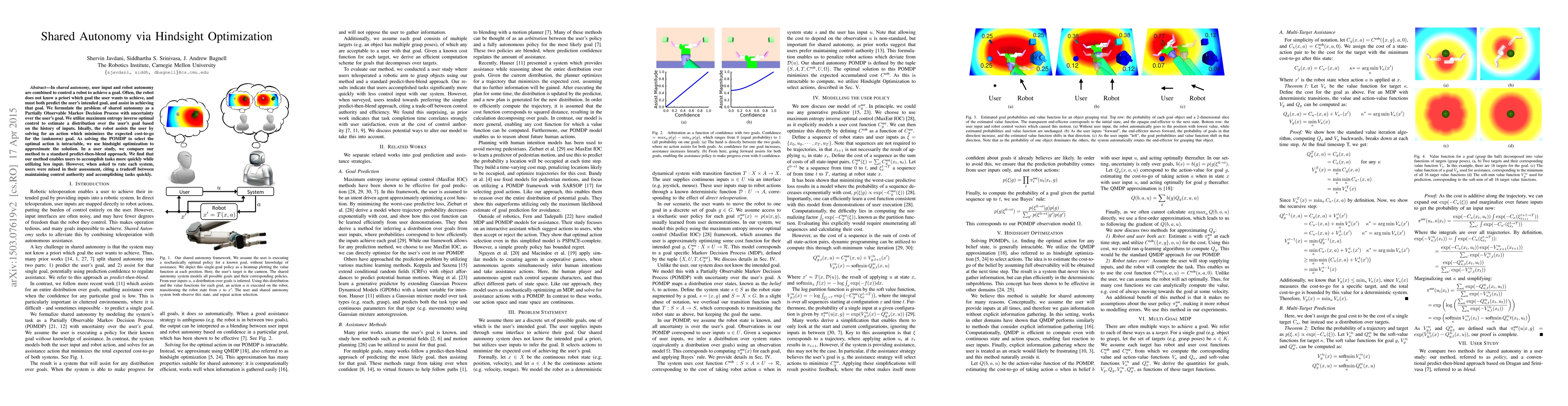 This paper explores shared autonomy in robotics through hindsight optimization, combining user input and robot autonomy to predict and assist in achieving unknown user goals. The authors find that their approach enables faster task completion with less user input, though users had mixed feelings about control authority.