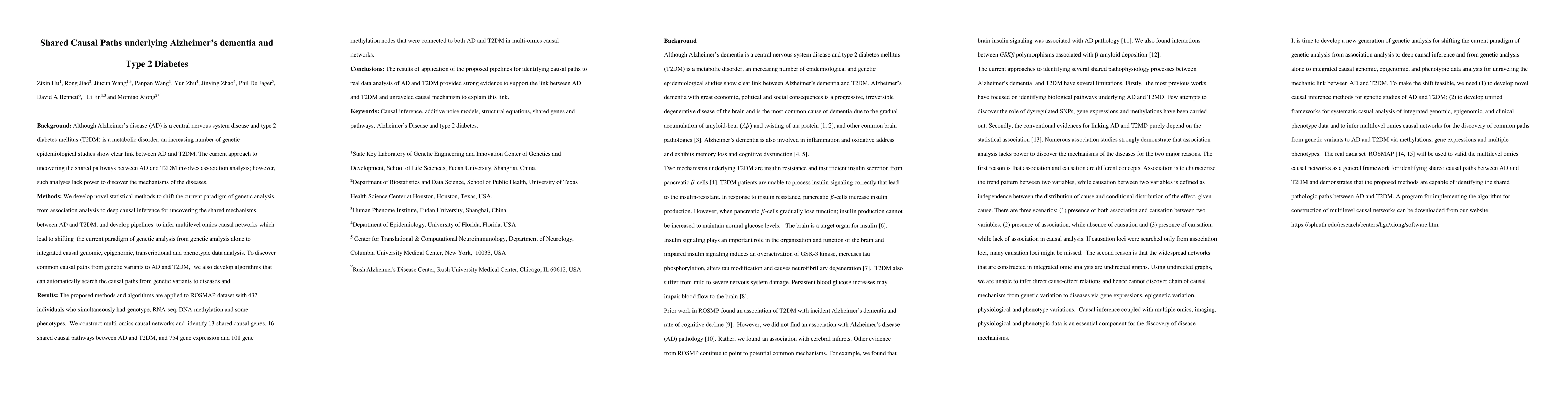 Background: Although Alzheimer's disease (AD) is a central nervous system disease and type 2 diabetes mellitus (T2DM) is a metabolic disorder, an increasing number of genetic epidemiological studies show clear link between AD and T2DM. The current approach to uncovering the shared pathways between AD and T2DM involves association analysis; however, such analyses lack power to discover the mechanisms of the diseases. Methods: We develop novel statistical methods to shift the current paradigm of genetic analysis from association analysis to deep causal inference for uncovering the shared mechanisms between AD and T2DM, and develop pipelines to infer multilevel omics causal networks which lead to shifting the current paradigm of genetic analysis from genetic analysis alone to integrated causal genomic, epigenomic, transcriptional and phenotypic data analysis. To discover common causal paths from genetic variants to AD and T2DM, we also develop algorithms that can automatically search the causal paths from genetic variants to diseases and Results: The proposed methods and algorithms are applied to ROSMAP dataset with 432 individuals who simultaneously had genotype, RNA-seq, DNA methylation and some phenotypes. We construct multi-omics causal networks and identify 13 shared causal genes, 16 shared causal pathways between AD and T2DM, and 754 gene expression and 101 gene methylation nodes that were connected to both AD and T2DM in multi-omics causal networks. Conclusions: The results of application of the proposed pipelines for identifying causal paths to real data analysis of AD and T2DM provided strong evidence to support the link between AD and T2DM and unraveled causal mechanism to explain this link.
