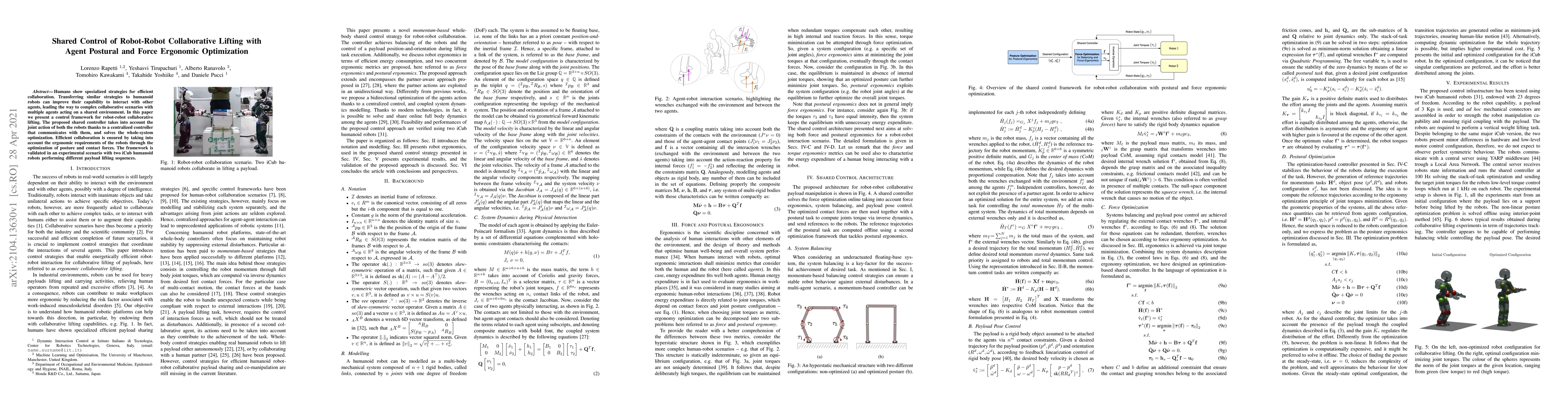 This paper proposes a shared control framework for robot-robot collaborative lifting, optimizing both posture and force to enhance ergonomic efficiency. The centralized controller optimizes the joint actions of two iCub humanoid robots, validated through experimental payload lifting sequences.