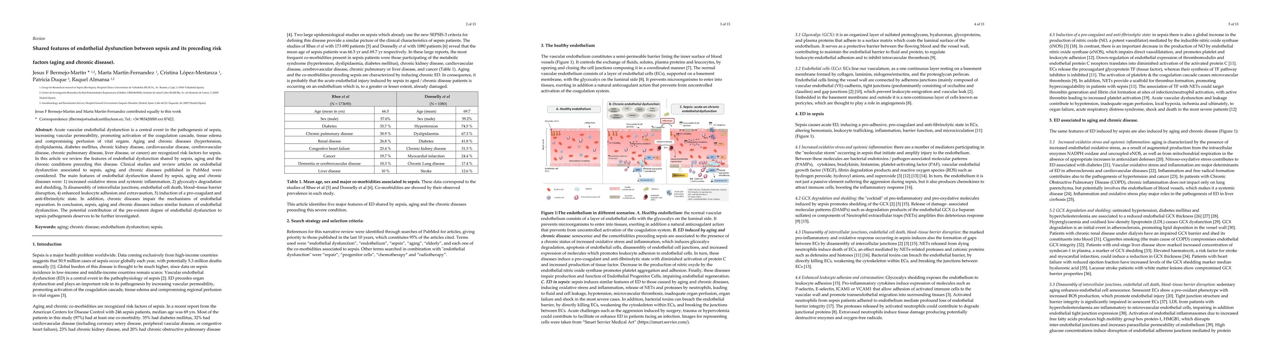 This paper reviews shared features of endothelial dysfunction in sepsis, aging, and chronic diseases, highlighting increased oxidative stress, glycocalyx degradation, and pro-coagulant states. It concludes that these conditions induce similar endothelial dysfunction, suggesting a need for further investigation into their combined impact on sepsis pathogenesis.