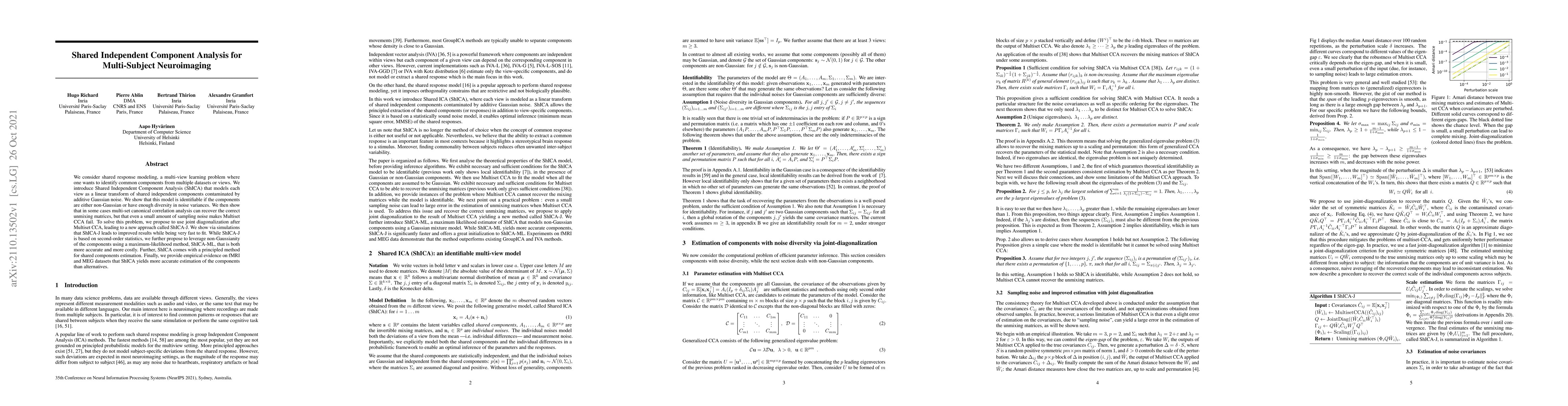 This paper introduces Shared Independent Component Analysis (ShICA) for modeling common components across multiple neuroimaging datasets. It proposes ShICA-J, an improved method combining Multiset Canonical Correlation Analysis and joint diagonalization, and ShICA-ML, a more accurate but computationally expensive maximum-likelihood variant, both showing superior performance on fMRI and MEG datasets.