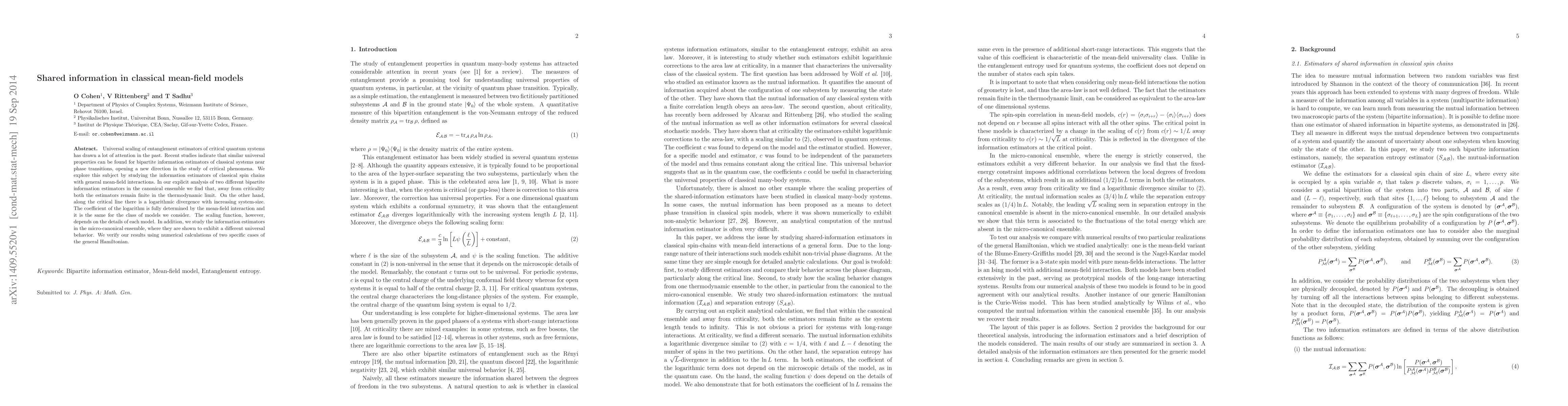 Universal scaling of entanglement estimators of critical quantum systems has drawn a lot of attention in the past. Recent studies indicate that similar universal properties can be found for bipartite information estimators of classical systems near phase transitions, opening a new direction in the study of critical phenomena. We explore this subject by studying the information estimators of classical spin chains with general mean-field interactions. In our explicit analysis of two different bipartite information estimators in the canonical ensemble we find that, away from criticality both the estimators remain finite in the thermodynamic limit. On the other hand, along the critical line there is a logarithmic divergence with increasing system-size. The coefficient of the logarithm is fully determined by the mean-field interaction and it is the same for the class of models we consider. The scaling function, however, depends on the details of each model. In addition, we study the information estimators in the micro-canonical ensemble, where they are shown to exhibit a different universal behavior. We verify our results using numerical calculations of two specific cases of the general Hamiltonian.