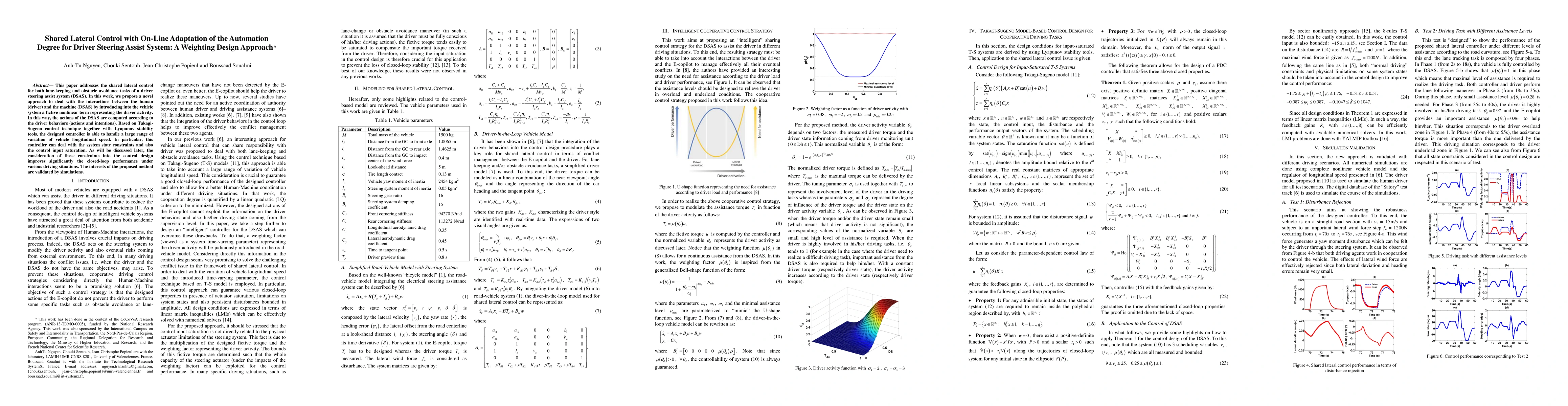 This paper addresses the shared lateral control for both lane-keeping and obstacle avoidance tasks of a driver steering assist system (DSAS). In this work, we propose a novel approach to deal with the interactions between the human (driver) and the machine (DSAS) by introducing into the vehicle system a fictive nonlinear term representing the driver activity. In this way, the actions of the DSAS are computed according to the driver behaviors (actions and intentions). Based on Takagi-Sugeno control technique together with Lyapunov stability tools, the designed controller is able to handle a large range of variation of vehicle longitudinal speed. In particular, this controller can deal with the system state constraints and also the control input saturation. As will be discussed later, the consideration of these constraints into the control design improves significantly the closed-loop performance under various driving situations. The interests of the proposed method are validated by simulations.