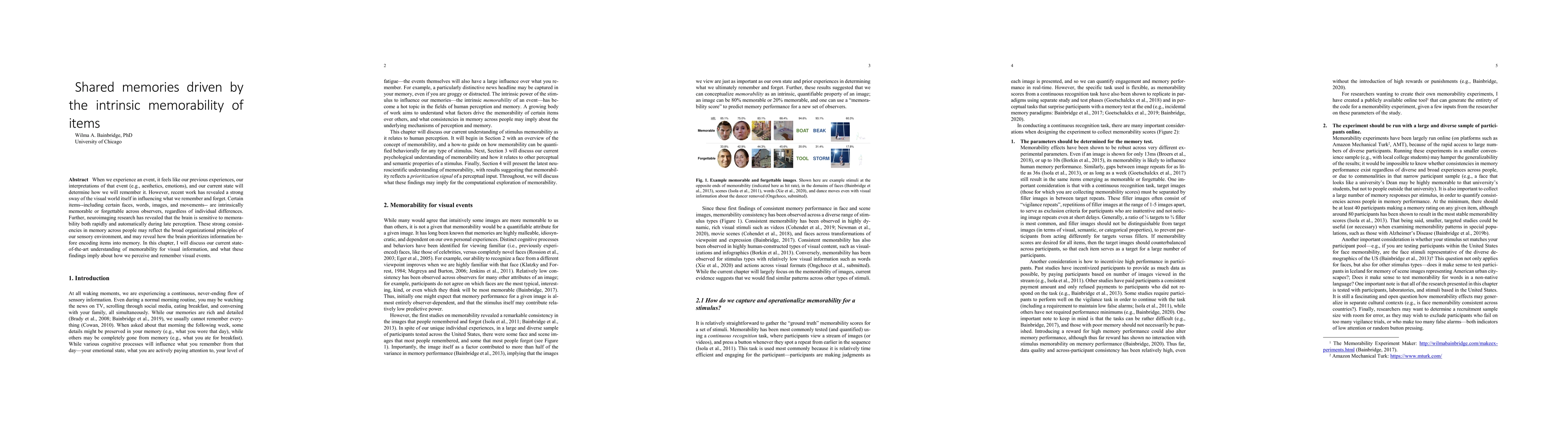 When we experience an event, it feels like our previous experiences, our interpretations of that event (e.g., aesthetics, emotions), and our current state will determine how we will remember it. However, recent work has revealed a strong sway of the visual world itself in influencing what we remember and forget. Certain items -- including certain faces, words, images, and movements -- are intrinsically memorable or forgettable across observers, regardless of individual differences. Further, neuroimaging research has revealed that the brain is sensitive to memorability both rapidly and automatically during late perception. These strong consistencies in memory across people may reflect the broad organizational principles of our sensory environment, and may reveal how the brain prioritizes information before encoding items into memory. In this chapter, I will discuss our current state-of-the-art understanding of memorability for visual information, and what these findings imply about how we perceive and remember visual events.