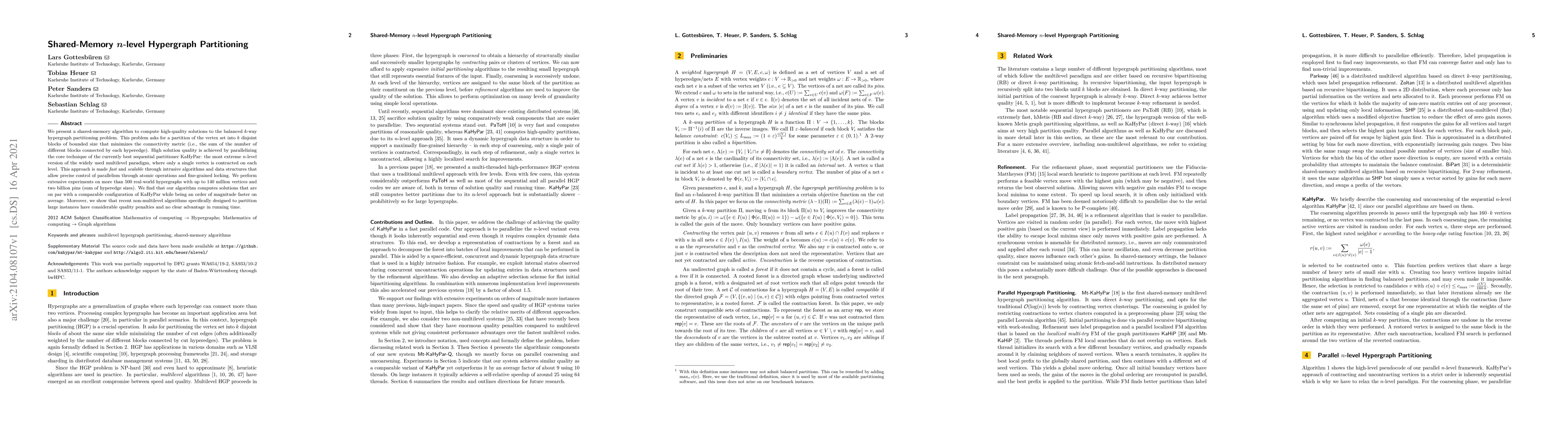This paper introduces a shared-memory algorithm for high-quality balanced $k$-way hypergraph partitioning, achieving solutions comparable to KaHyPar but significantly faster through parallelized $n$-level multilevel techniques. Experiments on large real-world hypergraphs demonstrate the algorithm's efficiency and superior performance compared to non-multilevel alternatives.