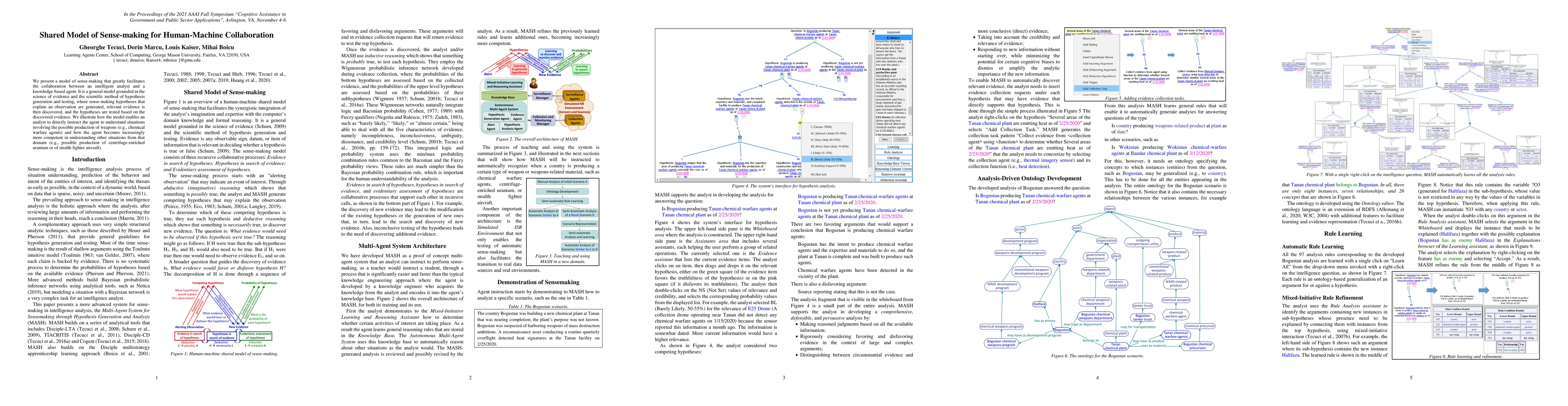 We present a model of sense-making that greatly facilitates the collaboration between an intelligent analyst and a knowledge-based agent. It is a general model grounded in the science of evidence and the scientific method of hypothesis generation and testing, where sense-making hypotheses that explain an observation are generated, relevant evidence is then discovered, and the hypotheses are tested based on the discovered evidence. We illustrate how the model enables an analyst to directly instruct the agent to understand situations involving the possible production of weapons (e.g., chemical warfare agents) and how the agent becomes increasingly more competent in understanding other situations from that domain (e.g., possible production of centrifuge-enriched uranium or of stealth fighter aircraft).