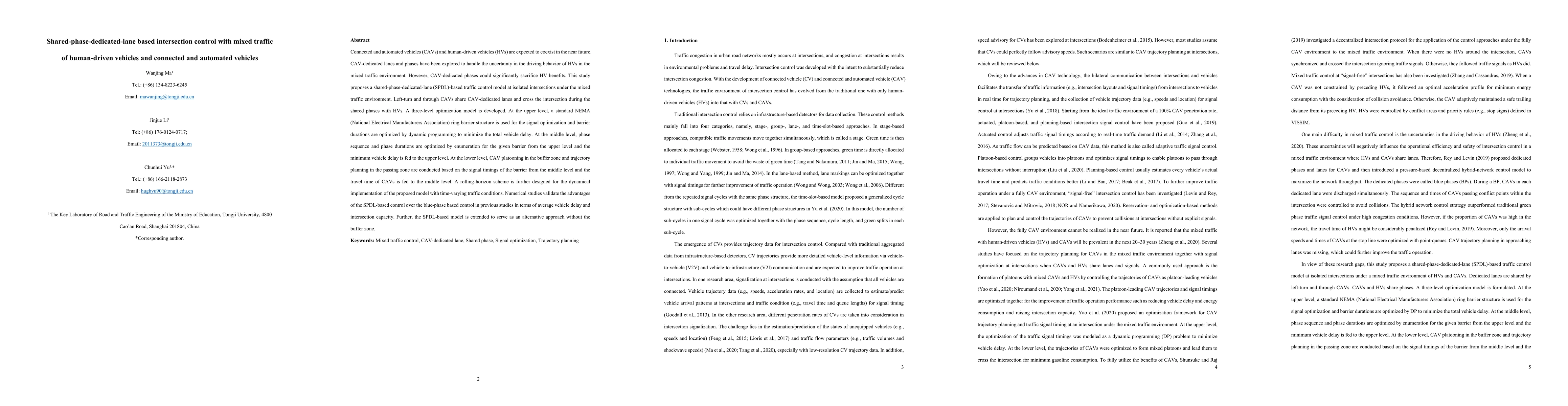 This study proposes a shared-phase-dedicated-lane (SPDL)-based traffic control model to manage mixed traffic of human-driven vehicles and connected and automated vehicles at intersections. The model optimizes signal timings and phase sequences to minimize total vehicle delay while allowing CAVs and HVs to share dedicated lanes during shared phases.