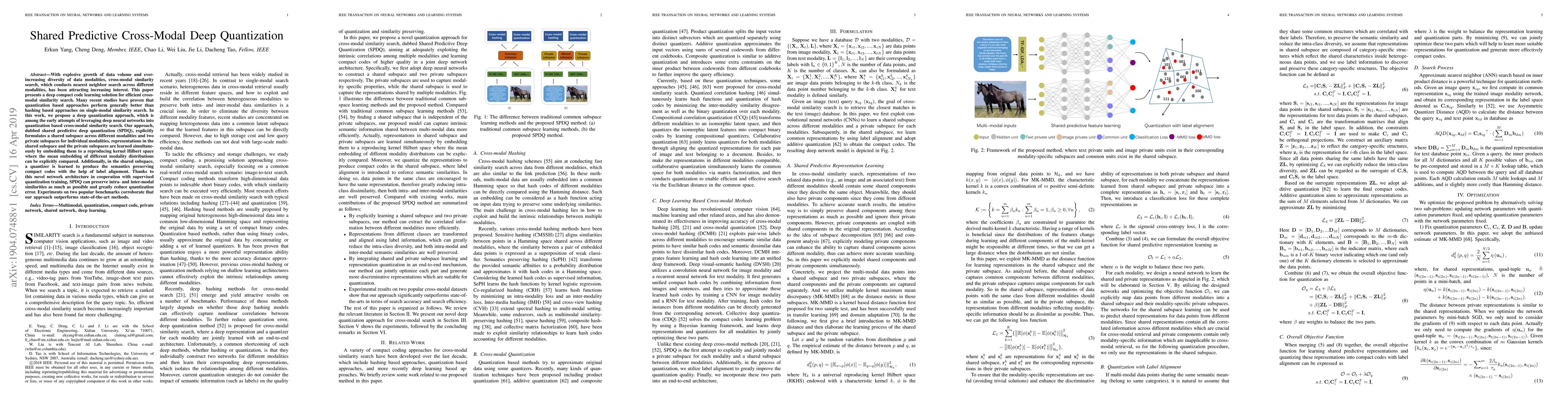 This paper introduces a novel deep quantization approach called shared predictive deep quantization (SPDQ) for efficient cross-modal similarity search. SPDQ formulates a shared subspace and private subspaces for individual modalities, learning representations that preserve intramodal and intermodal similarities, ultimately outperforming existing methods on benchmarks.