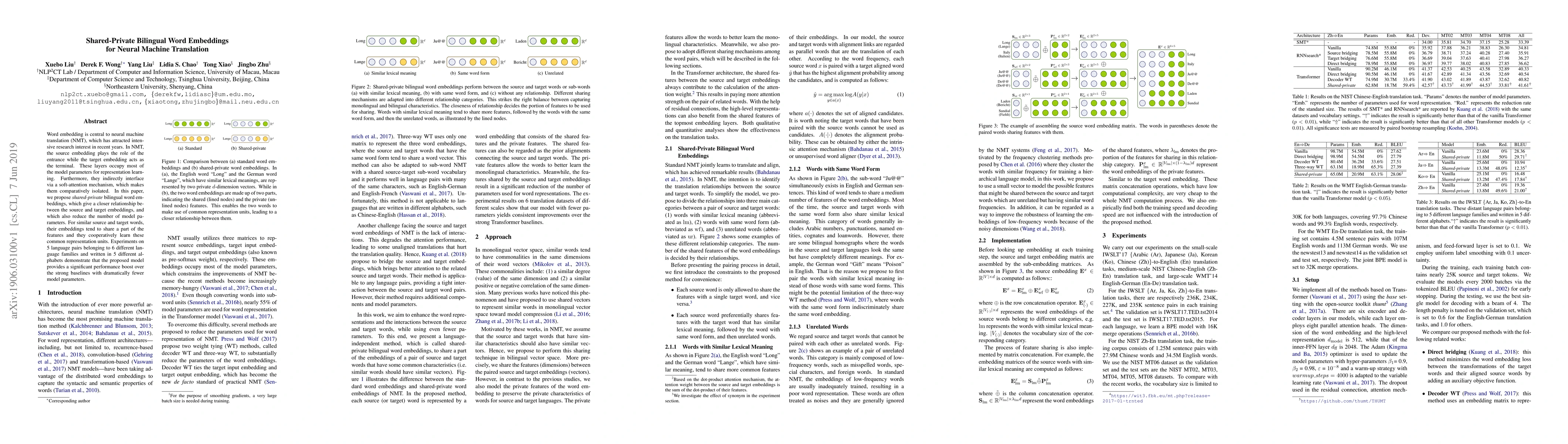 This paper proposes shared-private bilingual word embeddings to enhance neural machine translation (NMT) by fostering closer relationships between source and target embeddings, thereby reducing model parameters. Experimental results across 5 language pairs show significant performance improvements over baselines.
