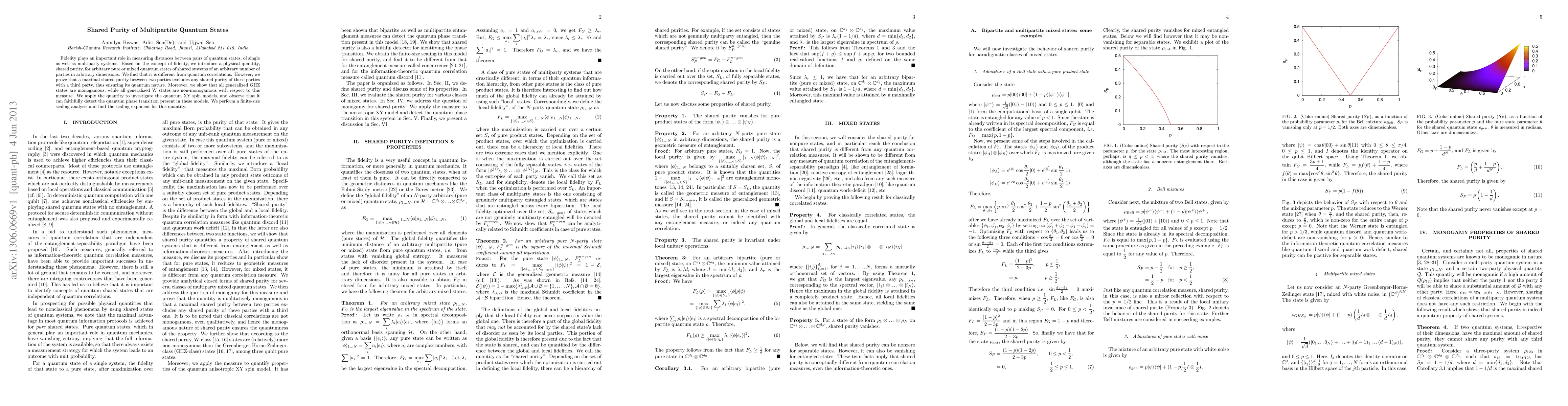 Fidelity plays an important role in measuring distances between pairs of quantum states, of single as well as multiparty systems. Based on the concept of fidelity, we introduce a physical quantity, shared purity, for arbitrary pure or mixed quantum states of shared systems of an arbitrary number of parties in arbitrary dimensions. We find that it is different from quantum correlations. However, we prove that a maximal shared purity between two parties excludes any shared purity of these parties with a third party, thus ensuring its quantum nature. Moreover, we show that all generalized GHZ states are monogamous, while all generalized W states are non-monogamous with respect to this measure. We apply the quantity to investigate the quantum XY spin models, and observe that it can faithfully detect the quantum phase transition present in these models. We perform a finite-size scaling analysis and find the scaling exponent for this quantity.