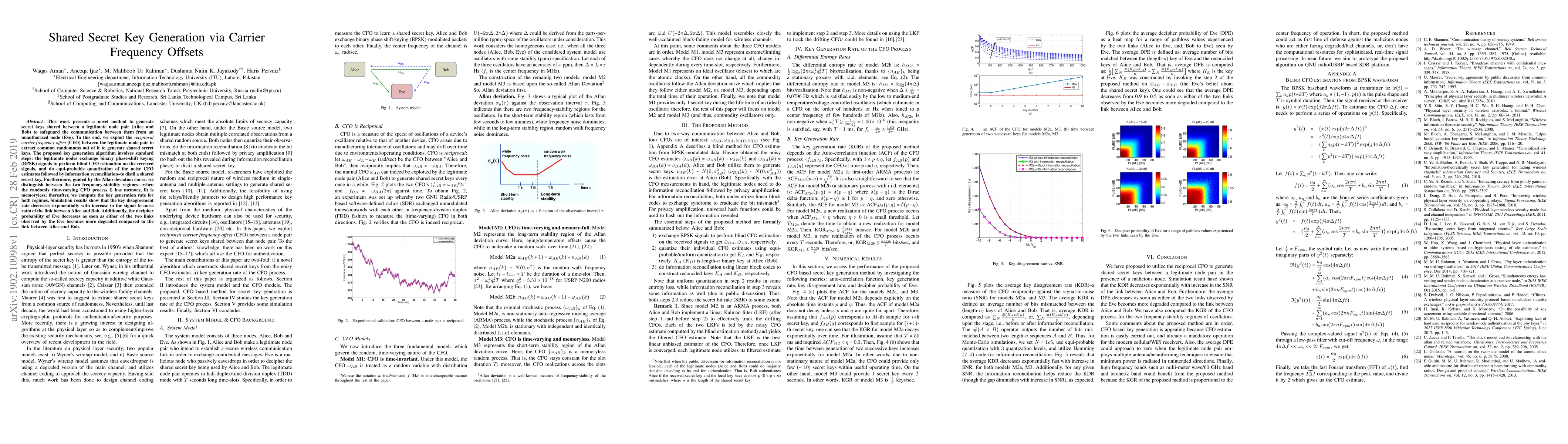 This paper proposes a method for generating shared secret keys between Alice and Bob using reciprocal carrier frequency offsets, ensuring secure communication against Eve. The algorithm involves CFO estimation, quantization, and information reconciliation, with key generation rates computed for different frequency-stability regimes.