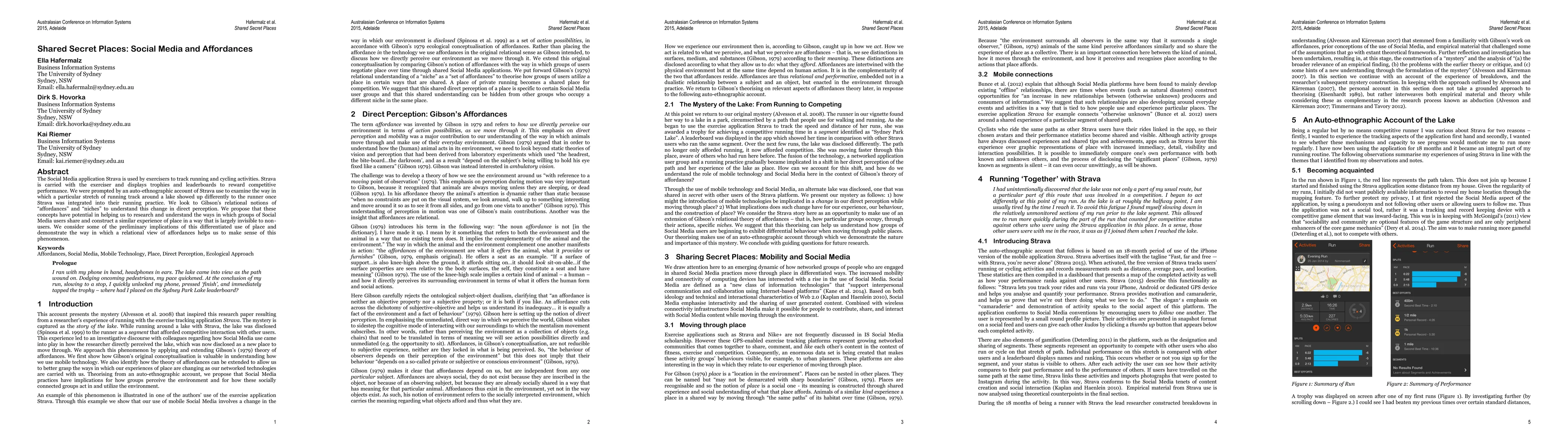 The Social Media application Strava is used by exercisers to track running and cycling activities. Strava is carried with the exerciser and displays trophies and leaderboards to reward competitive performance. We were prompted by an auto-ethnographic account of Strava use to examine the way in which a particular stretch of running track around a lake showed up differently to the runner once Strava was integrated into their running practice. We look to Gibsons relational notion of affordances and niches to understand this change in direct perception. We propose that these concepts have potential in helping us to research and understand the ways in which groups of Social Media users share and construct a similar experience of place in a way that is largely invisible to non-users. We consider some of the preliminary implications of this differentiated use of place and demonstrate the way in which a relational view of affordances helps us to make sense of this phenomenon.