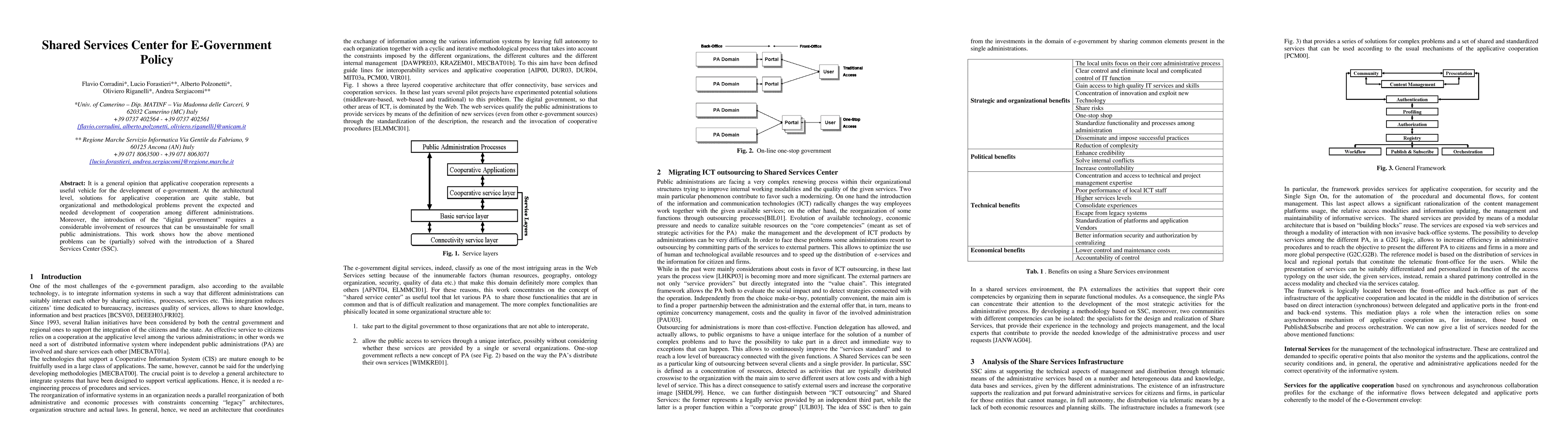 It is a general opinion that applicative cooperation represents a useful vehicle for the development of e-government. At the architectural level, solutions for applicative cooperation are quite stable, but organizational and methodological problems prevent the expected and needed development of cooperation among different administrations. Moreover, the introduction of the digital government requires a considerable involvement of resources that can be unsustainable for small public administrations. This work shows how the above mentioned problems can be (partially) solved with the introduction of a Shared Services Center (SSC).