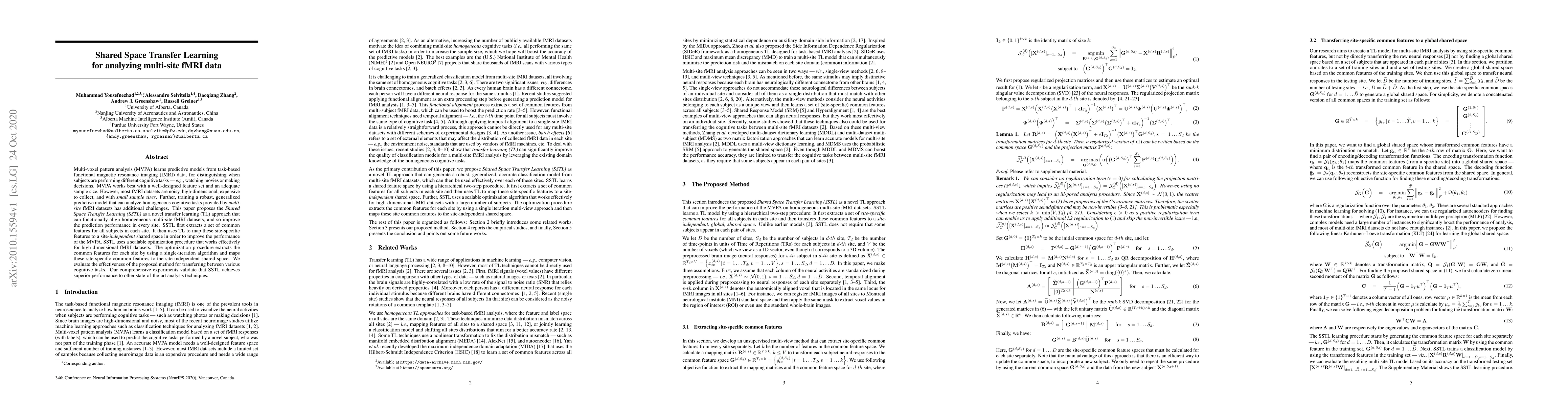 This paper introduces Shared Space Transfer Learning (SSTL) to improve multi-site fMRI data analysis by aligning datasets and enhancing predictive model performance. SSTL extracts common features and maps them to a shared space, achieving superior results compared to other techniques.