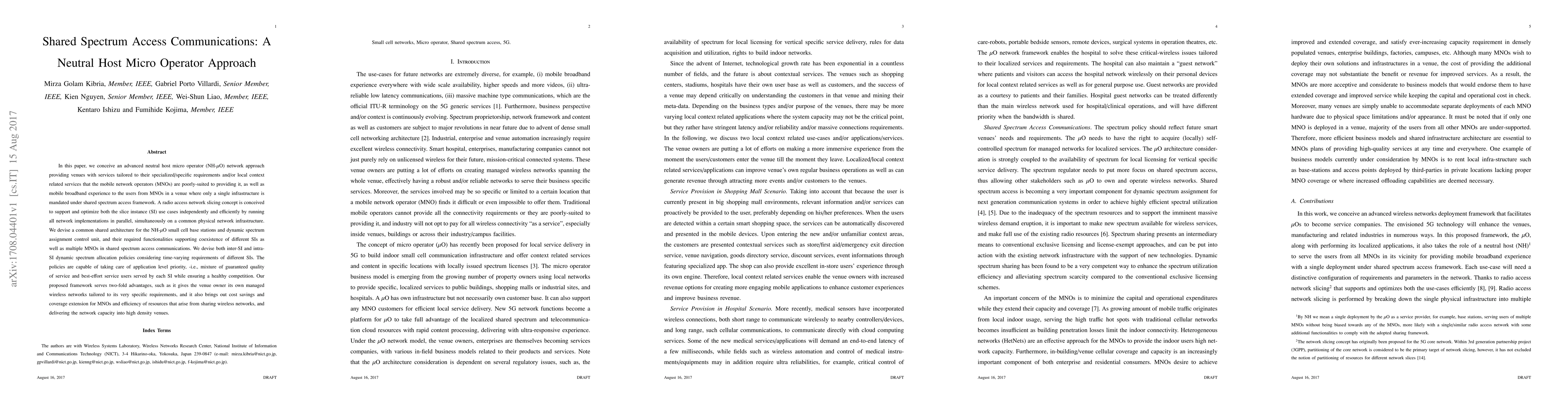 This paper proposes a neutral host micro operator (NH-μO) network approach that provides tailored services to venues and optimizes mobile broadband experience for users, leveraging a shared spectrum access framework. The framework includes a radio access network slicing concept and dynamic spectrum allocation policies to efficiently manage multiple service instances and coexisting mobile network operators, offering venue-specific networks and cost savings for operators.