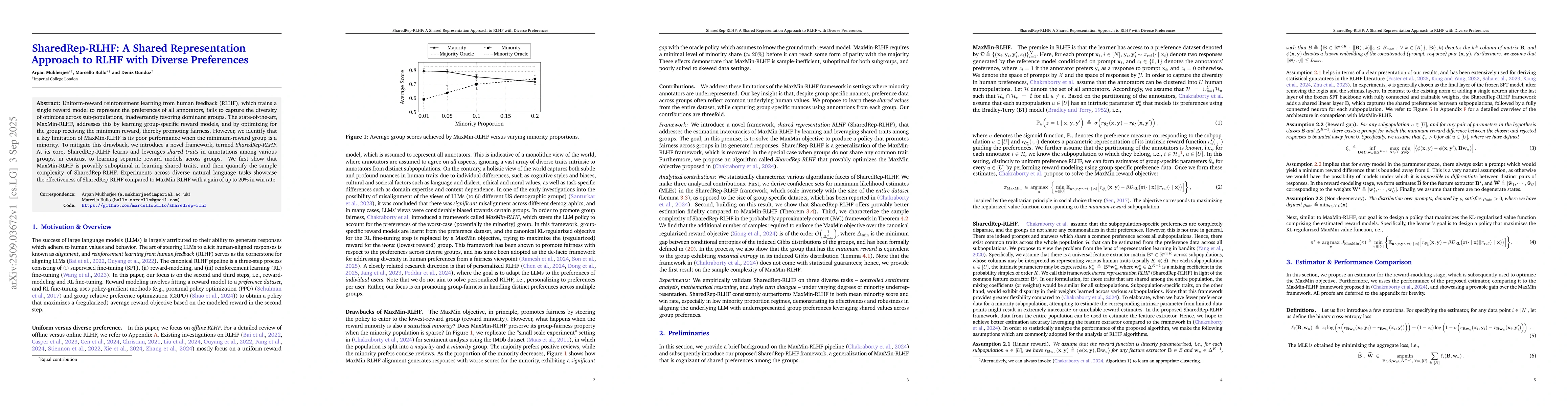 Uniform-reward reinforcement learning from human feedback (RLHF), which trains a single reward model to represent the preferences of all annotators, fails to capture the diversity of opinions across sub-populations, inadvertently favoring dominant groups. The state-of-the-art, MaxMin-RLHF, addresses this by learning group-specific reward models, and by optimizing for the group receiving the minimum reward, thereby promoting fairness. However, we identify that a key limitation of MaxMin-RLHF is its poor performance when the minimum-reward group is a minority. To mitigate this drawback, we introduce a novel framework, termed {\em SharedRep-RLHF}. At its core, SharedRep-RLHF learns and leverages {\em shared traits} in annotations among various groups, in contrast to learning separate reward models across groups. We first show that MaxMin-RLHF is provably suboptimal in learning shared traits, and then quantify the sample complexity of SharedRep-RLHF. Experiments across diverse natural language tasks showcase the effectiveness of SharedRep-RLHF compared to MaxMin-RLHF with a gain of up to 20% in win rate.