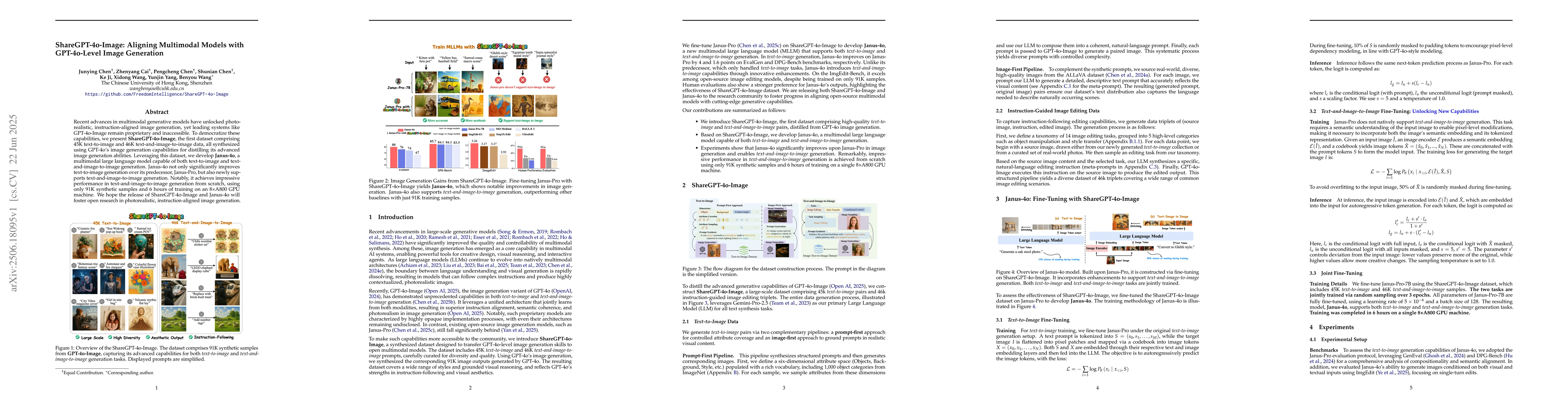 The paper introduces ShareGPT-4o-Image, a public dataset of 91K text-to-image and text-and-image-to-image pairs generated by GPT-4o. Using this dataset, the authors develop Janus-4o, a multimodal large language model. Janus-4o surpasses its predecessor in text-to-image generation and introduces text-and-image-to-image generation, achieving impressive results with just 91K synthetic samples and 6 hours of training on an 8 A800-GPU machine, aiming to promote open research in photorealistic, instruction-aligned image generation.