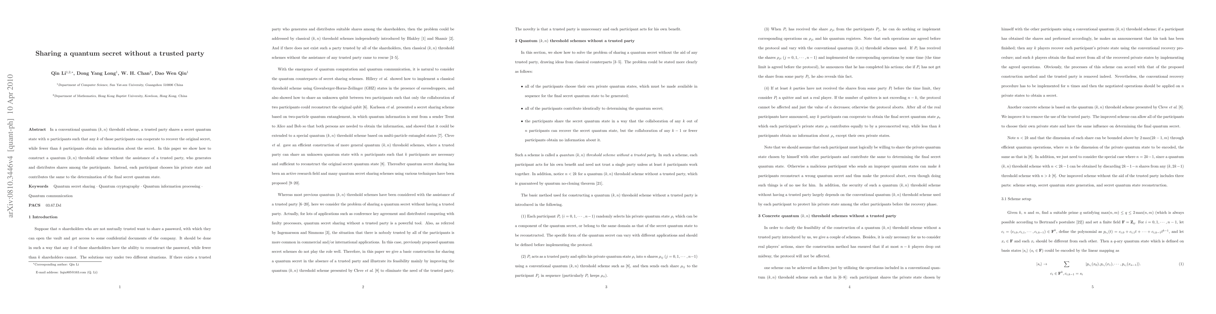 A basic construction of quantum (k,n) threshold schemes without a trusted party was presented, demonstrating its feasibility.