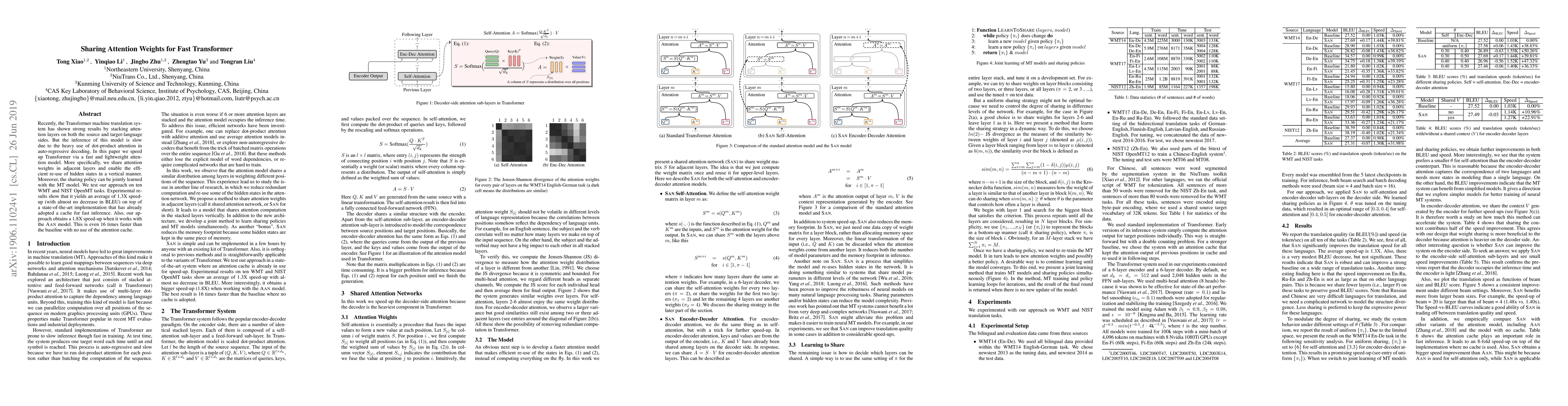 This paper proposes a method to speed up the Transformer model by sharing attention weights across adjacent layers and enabling efficient reuse of hidden states. The approach achieves an average 1.3X speed-up with minimal loss in translation quality, and a 1.8X speed-up when combined with the Aan model, outperforming the baseline by 16 times.