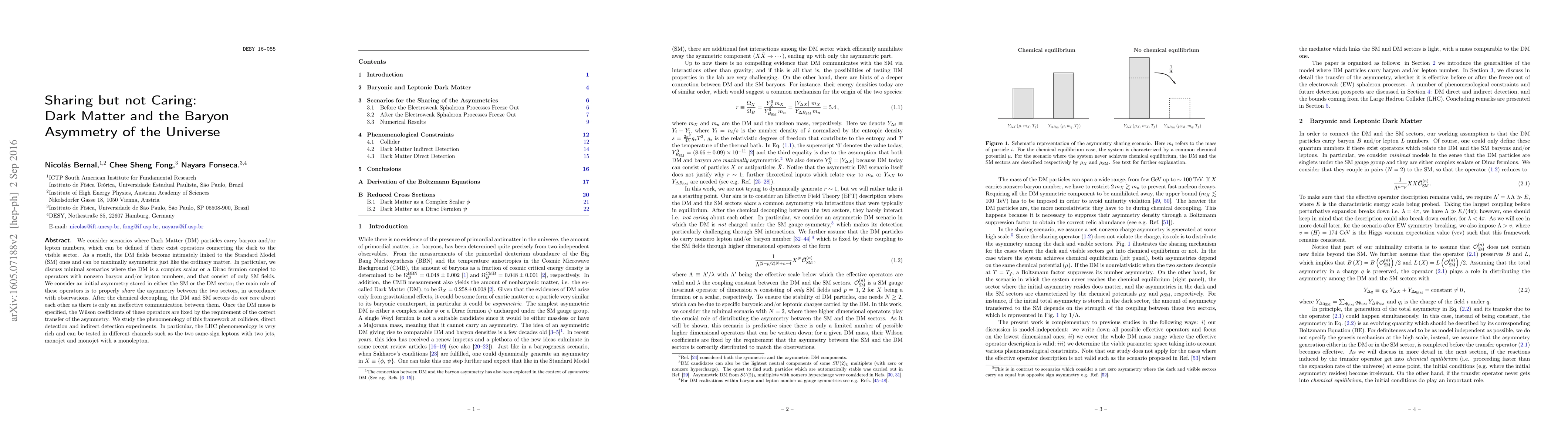 We consider scenarios where Dark Matter (DM) particles carry baryon and/or lepton numbers, which can be defined if there exist operators connecting the dark to the visible sector. As a result, the DM fields become intimately linked to the Standard Model (SM) ones and can be maximally asymmetric just like the ordinary matter. In particular, we discuss minimal scenarios where the DM is a complex scalar or a Dirac fermion coupled to operators with nonzero baryon and/or lepton numbers, and that consist of only SM fields. We consider an initial asymmetry stored in either the SM or the DM sector; the main role of these operators is to properly $share$ the asymmetry between the two sectors, in accordance with observations. After the chemical decoupling, the DM and SM sectors do $not$ $care$ about each other as there is only an ineffective communication between them. Once the DM mass is specified, the Wilson coefficients of these operators are fixed by the requirement of the correct transfer of the asymmetry. We study the phenomenology of this framework at colliders, direct detection and indirect detection experiments. In particular, the LHC phenomenology is very rich and can be tested in different channels such as the two same-sign leptons with two jets, monojet and monojet with a monolepton.