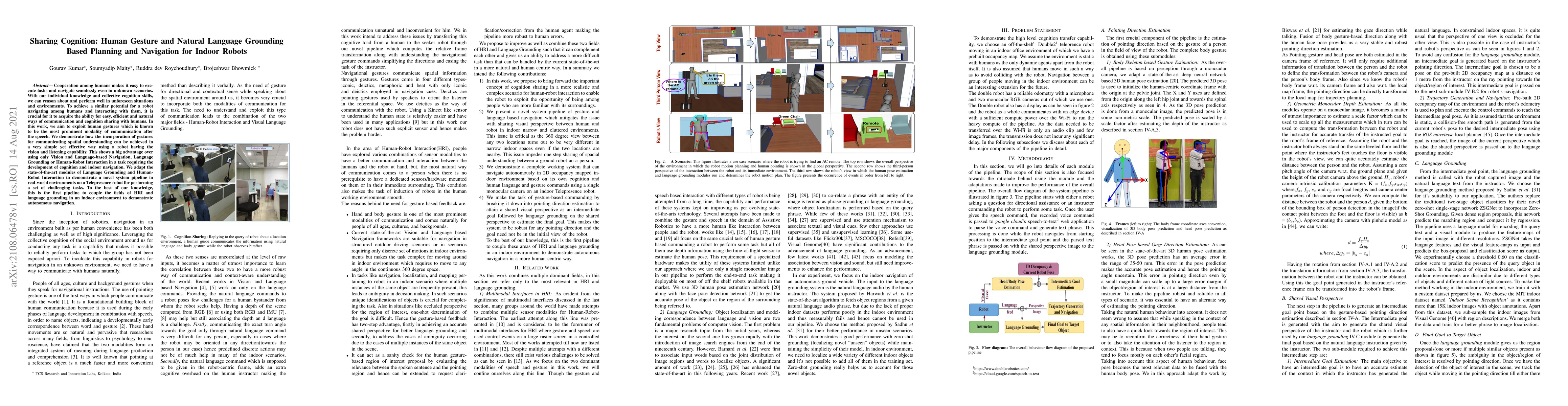 Cooperation among humans makes it easy to execute tasks and navigate seamlessly even in unknown scenarios. With our individual knowledge and collective cognition skills, we can reason about and perform well in unforeseen situations and environments. To achieve a similar potential for a robot navigating among humans and interacting with them, it is crucial for it to acquire the ability for easy, efficient and natural ways of communication and cognition sharing with humans. In this work, we aim to exploit human gestures which is known to be the most prominent modality of communication after the speech. We demonstrate how the incorporation of gestures for communicating spatial understanding can be achieved in a very simple yet effective way using a robot having the vision and listening capability. This shows a big advantage over using only Vision and Language-based Navigation, Language Grounding or Human-Robot Interaction in a task requiring the development of cognition and indoor navigation. We adapt the state-of-the-art modules of Language Grounding and Human-Robot Interaction to demonstrate a novel system pipeline in real-world environments on a Telepresence robot for performing a set of challenging tasks. To the best of our knowledge, this is the first pipeline to couple the fields of HRI and language grounding in an indoor environment to demonstrate autonomous navigation.