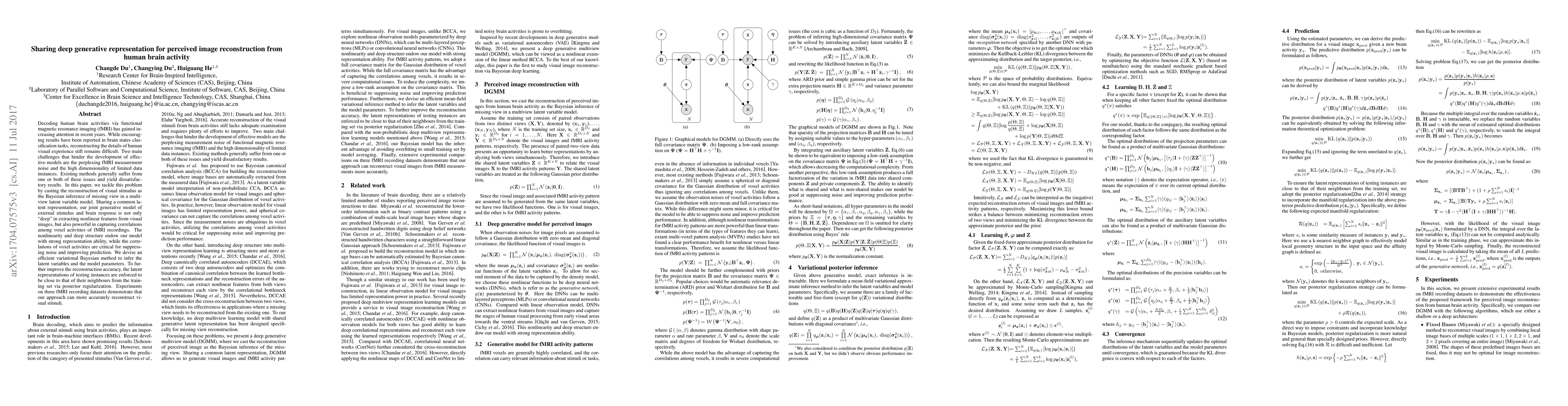 This paper proposes a deep generative model to reconstruct visual stimuli from fMRI data by addressing measurement noise and high dimensionality challenges. The model shares a common latent representation to capture correlations among voxel activities, improving noise suppression and prediction accuracy.
