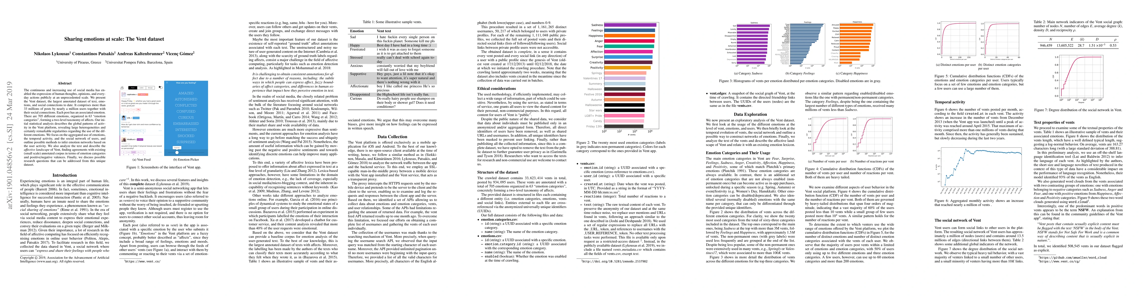The continuous and increasing use of social media has enabled the expression of human thoughts, opinions, and everyday actions publicly at an unprecedented scale. We present the Vent dataset, the largest annotated dataset of text, emotions, and social connections to date. It comprises more than 33 millions of posts by nearly a million of users together with their social connections. Each post has an associated emotion. There are 705 different emotions, organized in 63 "emotion categories", forming a two-level taxonomy of affects. Our initial statistical analysis describes the global patterns of activity in the Vent platform, revealing large heterogenities and certain remarkable regularities regarding the use of the different emotions. We focus on the aggregated use of emotions, the temporal activity, and the social network of users, and outline possible methods to infer emotion networks based on the user activity. We also analyze the text and describe the affective landscape of Vent, finding agreements with existing (small scale) annotated corpus in terms of emotion categories and positive/negative valences. Finally, we discuss possible research questions that can be addressed from this unique dataset.
