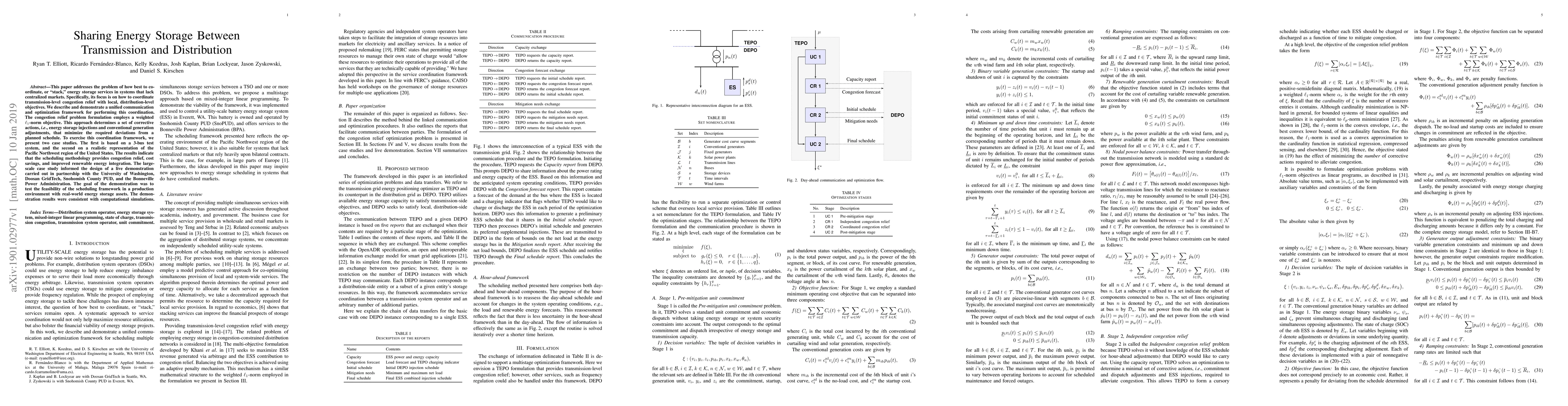 This paper addresses the problem of how best to coordinate, or `stack,' energy storage services in systems that lack centralized markets. Specifically, its focus is on how to coordinate transmission-level congestion relief with local, distribution-level objectives. We describe and demonstrate a unified communication and optimization framework for performing this coordination. The congestion relief problem formulation employs a weighted $\ell_{1}$-norm objective. This approach determines a set of corrective actions, i.e., energy storage injections and conventional generation adjustments, that minimize the required deviations from a planned schedule. To exercise this coordination framework, we present two case studies. The first is based on a 3-bus test system, and the second on a realistic representation of the Pacific Northwest region of the United States. The results indicate that the scheduling methodology provides congestion relief, cost savings, and improved renewable energy integration. The large-scale case study informed the design of a live demonstration carried out in partnership with the University of Washington, Doosan GridTech, Snohomish County PUD, and the Bonneville Power Administration. The goal of the demonstration was to test the feasibility of the scheduling framework in a production environment with real-world energy storage assets. The demonstration results were consistent with computational simulations.
