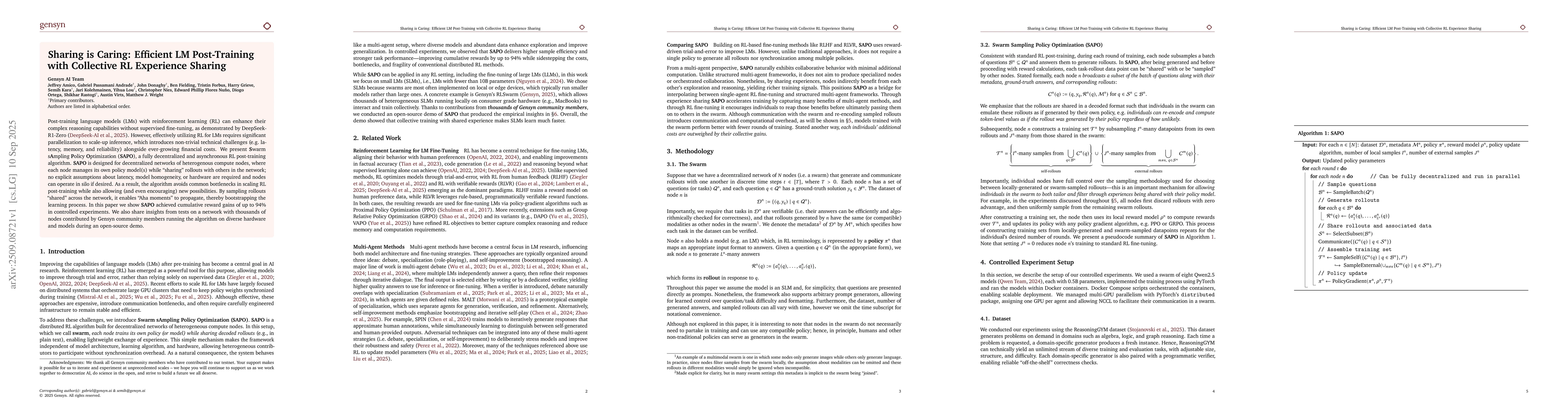 Post-training language models (LMs) with reinforcement learning (RL) can enhance their complex reasoning capabilities without supervised fine-tuning, as demonstrated by DeepSeek-R1-Zero. However, effectively utilizing RL for LMs requires significant parallelization to scale-up inference, which introduces non-trivial technical challenges (e.g. latency, memory, and reliability) alongside ever-growing financial costs. We present Swarm sAmpling Policy Optimization (SAPO), a fully decentralized and asynchronous RL post-training algorithm. SAPO is designed for decentralized networks of heterogenous compute nodes, where each node manages its own policy model(s) while "sharing" rollouts with others in the network; no explicit assumptions about latency, model homogeneity, or hardware are required and nodes can operate in silo if desired. As a result, the algorithm avoids common bottlenecks in scaling RL post-training while also allowing (and even encouraging) new possibilities. By sampling rollouts "shared" across the network, it enables "Aha moments" to propagate, thereby bootstrapping the learning process. In this paper we show SAPO achieved cumulative reward gains of up to 94% in controlled experiments. We also share insights from tests on a network with thousands of nodes contributed by Gensyn community members running the algorithm on diverse hardware and models during an open-source demo.